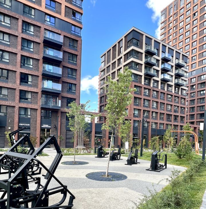 Благоустроенный внутренний зелёный двор без машин с зонами отдыха для детей и взрослых, красивый ландшафт, тренажёрные площадки.