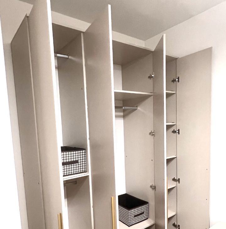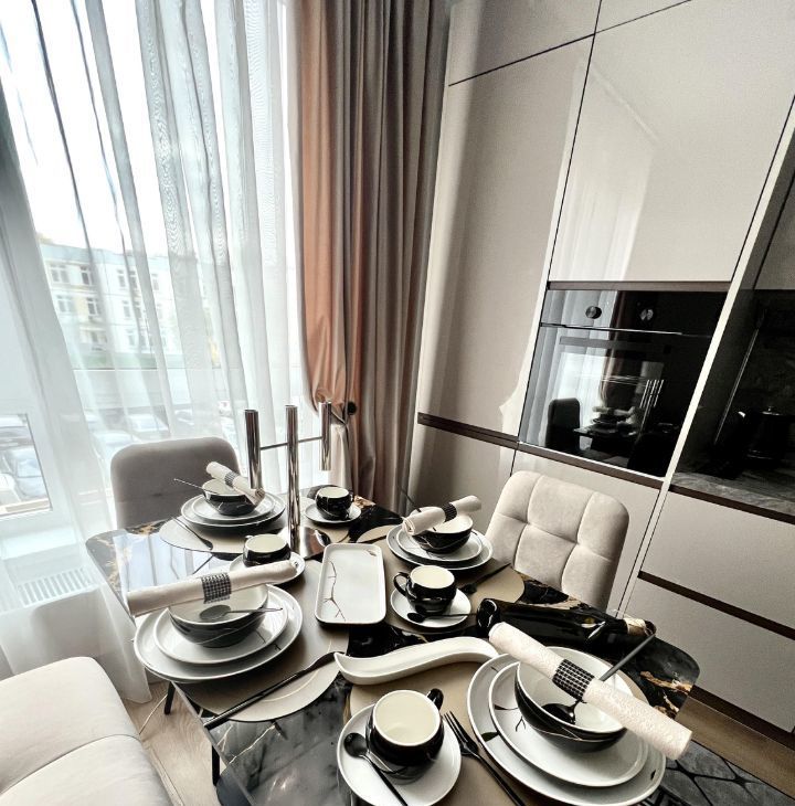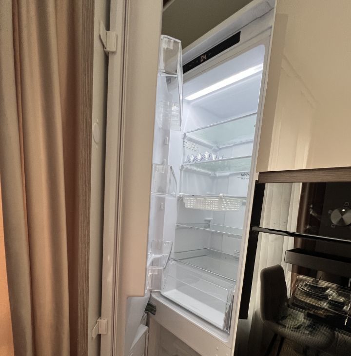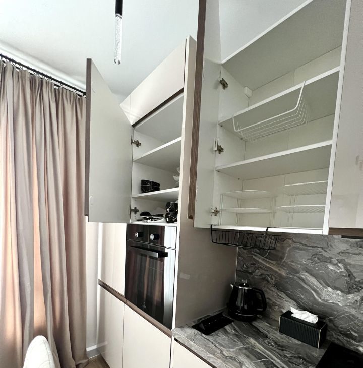 Кухонная мебель полностью оснащена встроенной бытовой техникой, новой посудой и аксессуарами для хранения.