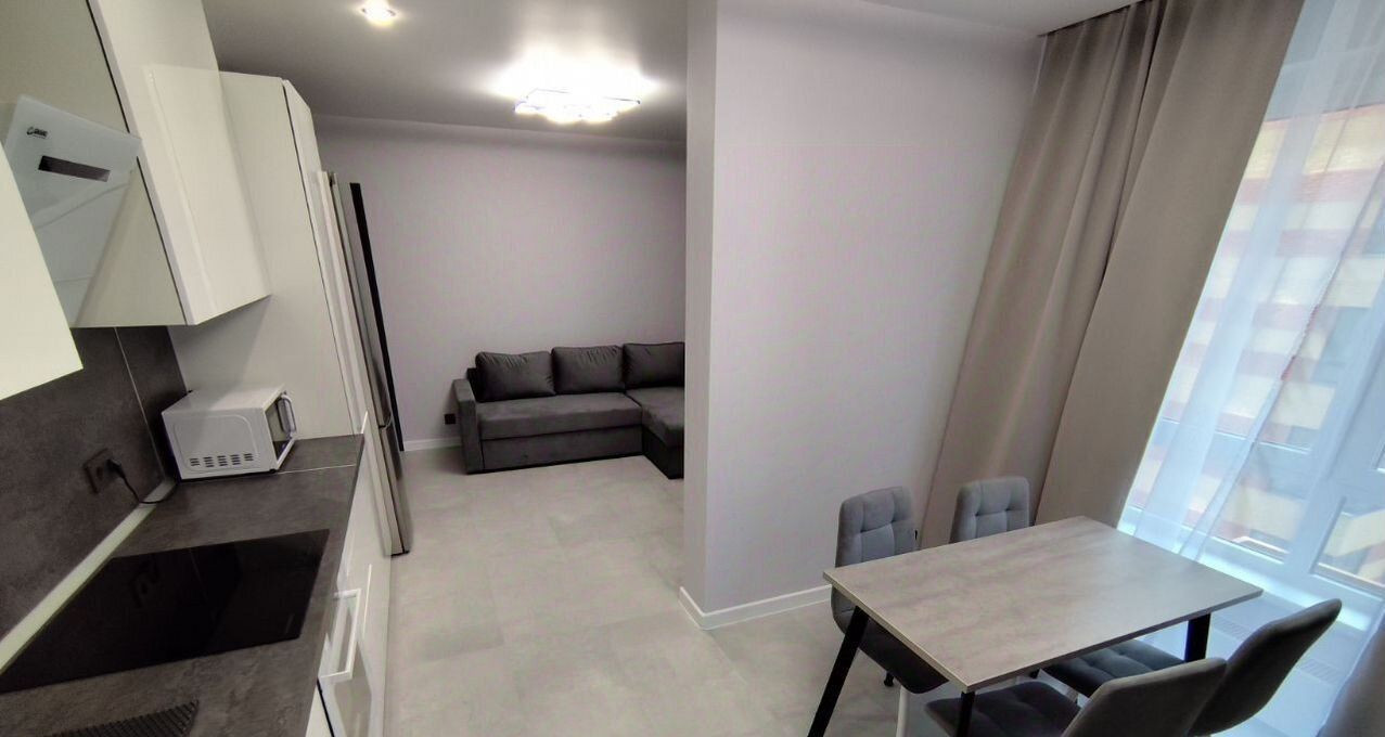 Две изолированные комнаты и кухня-гостиная. На кухне и в комнате есть вся необходимая мебель. Из техники в квартире есть кондиционер, холодильник и стиральная машина. Окна выходят во двор, что обеспечивает тишину и уют.