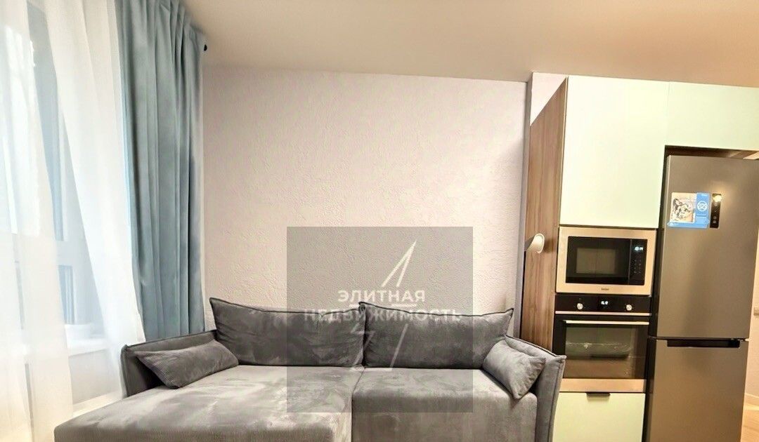 • Кухня, гостиная с современным кухонным гарнитуром, встроенной техникой и зоной отдыха.