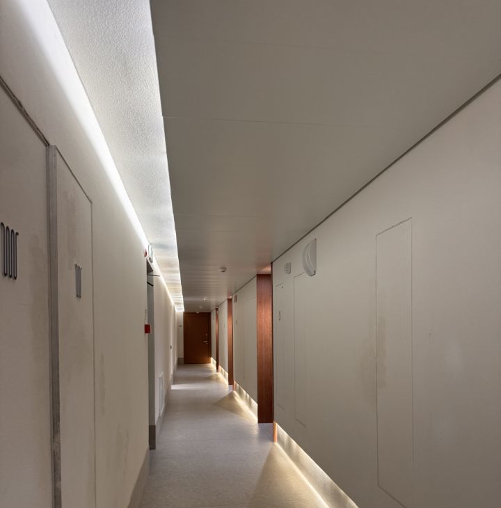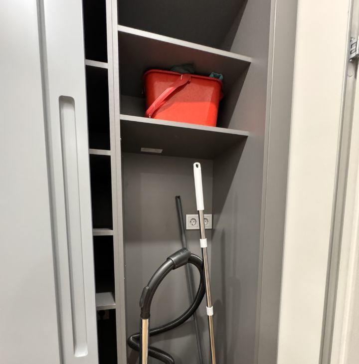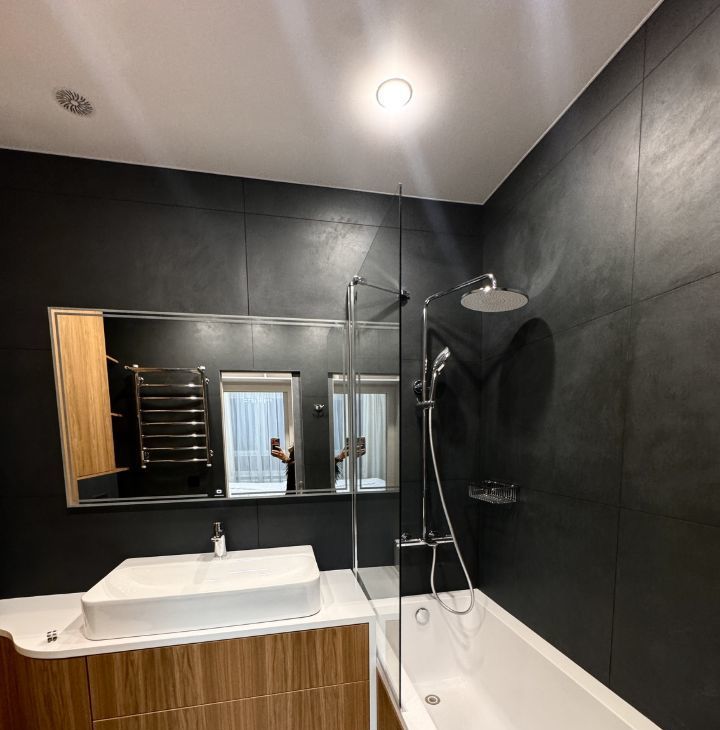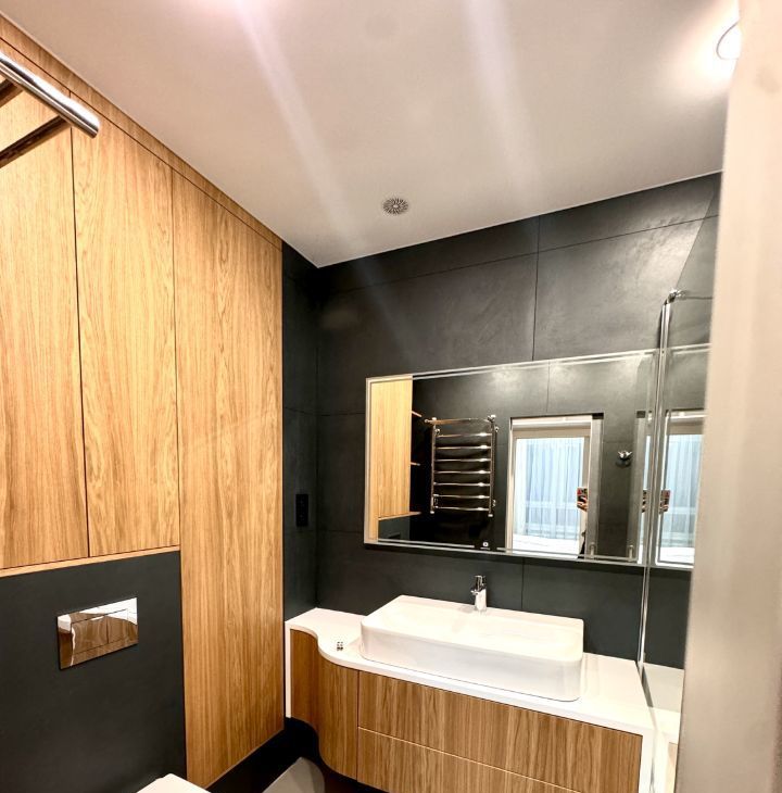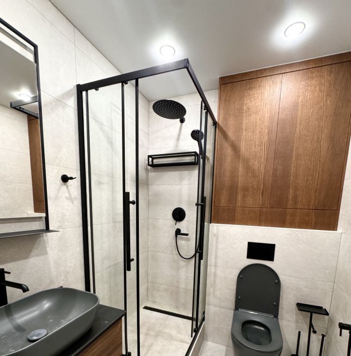 - Два отдельных туалета: Один с душевой кабиной для повседневного использования, второй - с ванной. Оба в современном стиле: белая сантехника, LED-подсветка и тёплая половая плитка.