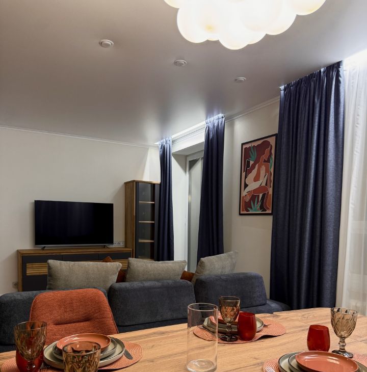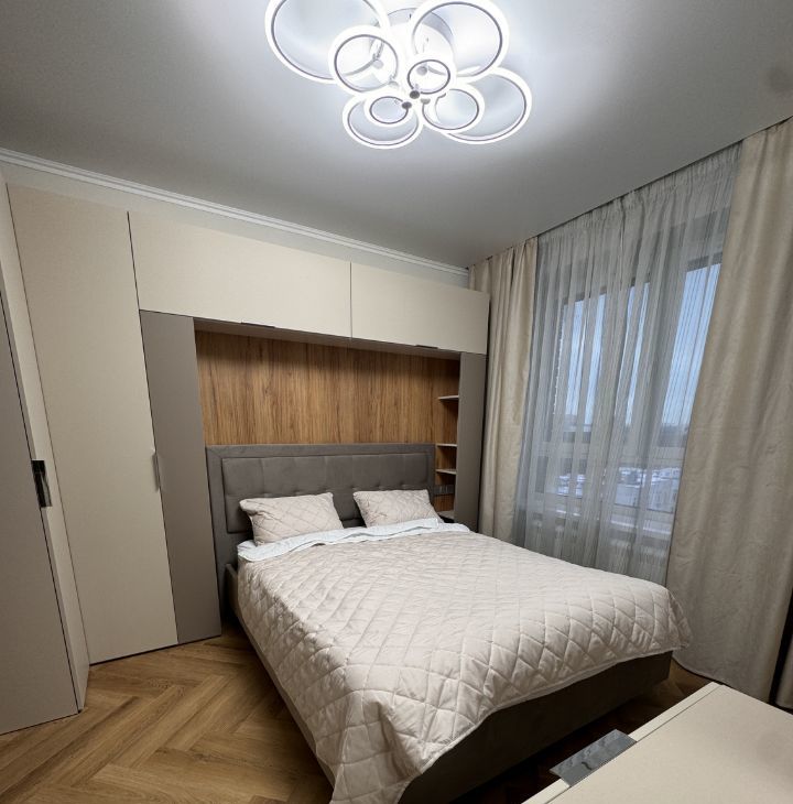 - Две уютные спальни: Главная спальня с большой двуспальной кроватью и панорамными окнами, выходящими на тихий двор. Вторая — идеальна для детей или гостей, с удобным раскладным диваном и встроенным шкафом. Здесь легко создать атмосферу релакса после долгого дня.