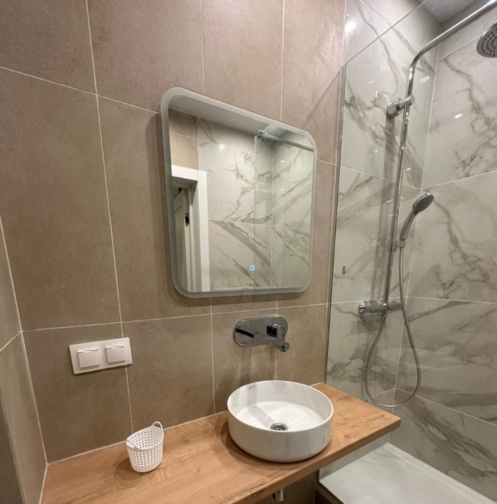 Просторная планировка включает две совмещенные ванные комнаты, одна с ванной, другая с душевой кабиной. Квартира полностью меблирована, мебель есть как на кухне, так и в комнатах. Из техники есть все необходимое: кондиционер для приятного климата, холодильник для хранения продуктов, телевизор для отдыха, посудомоечная и стиральная машины для удобства.