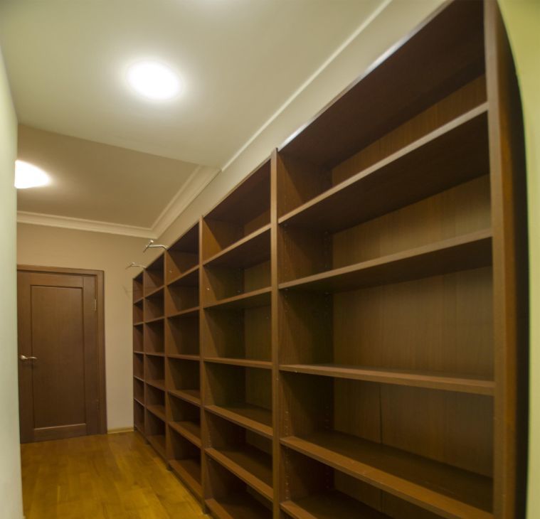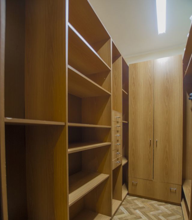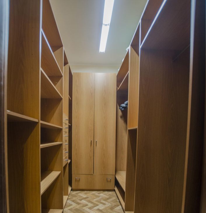 Практичные системы хранения, включая отдельную гардеробную, несколько шкафов с зеркалами.