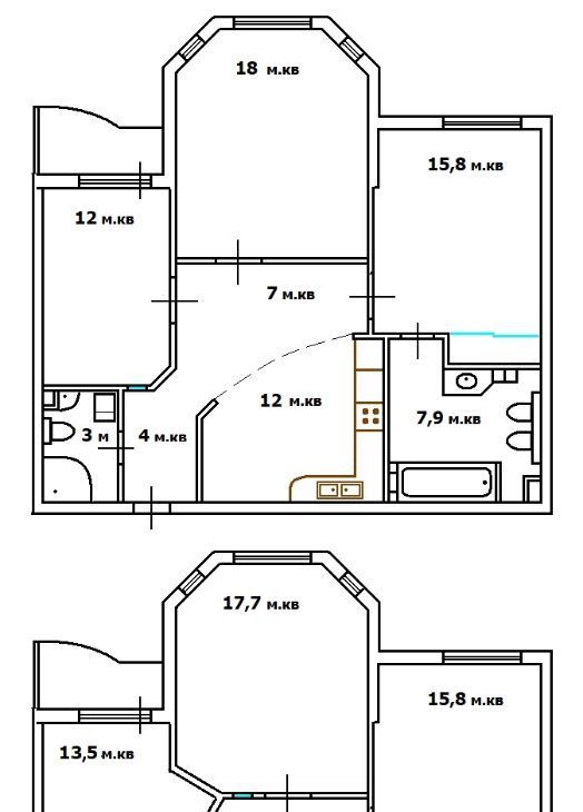 Планировка также предусматривает возможность быстро и с минимальным вложением средств реализовать решение с тремя изолированными комнатами (к примеру, 17,7-13,5-16 кв.м. и межкомнатным пространством 5,8 кв.м. расположенным перед кухней 12 кв.м. (варианты планировок на фото).