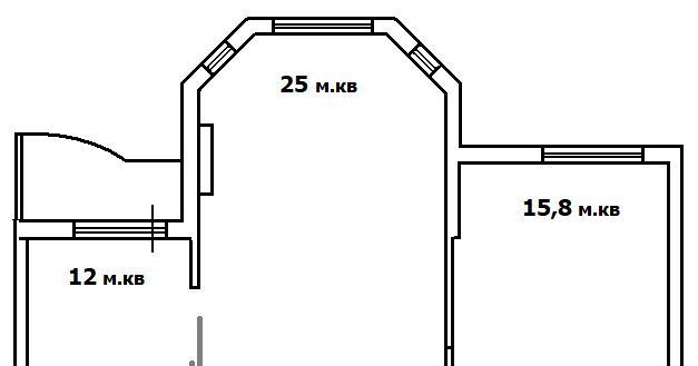 Две комнаты 25+12 и кухня 12 квадратов, в настоящий момент не разделены перегородками и, по сути, представляют собой единое пространство 49 кв.м., к которому примыкает третья изолированная комната (16 кв.м.) с санузлом (7,9 кв.м.).