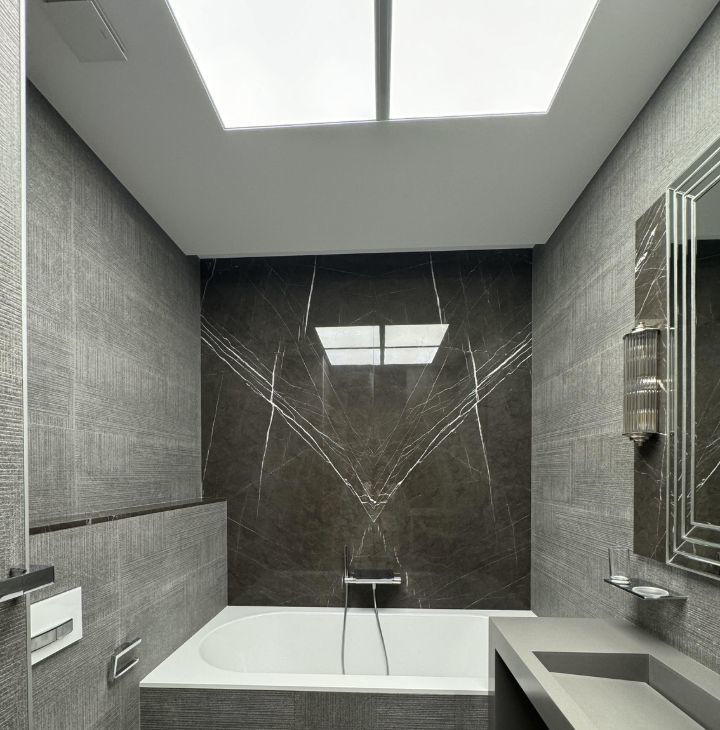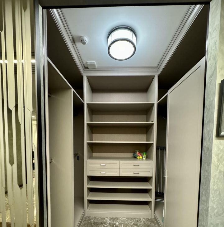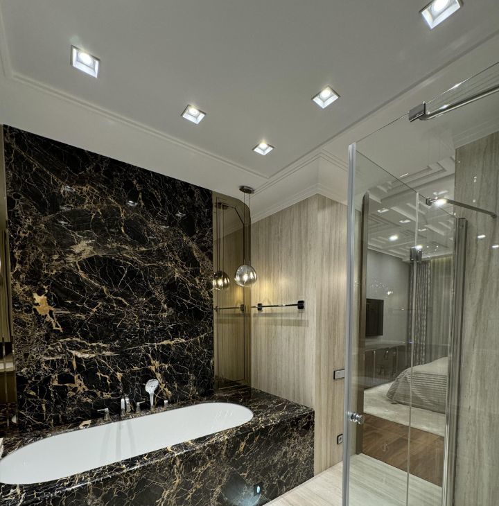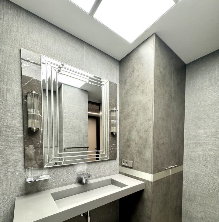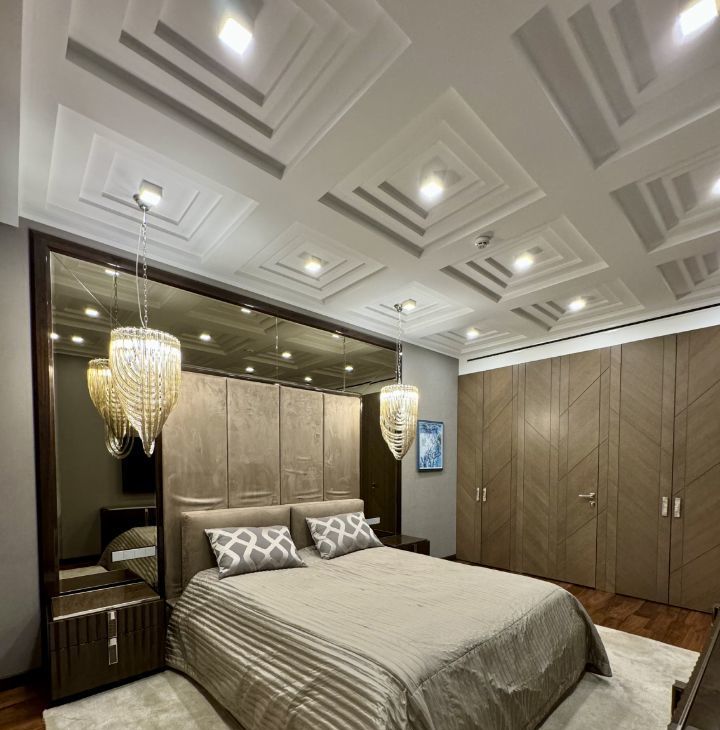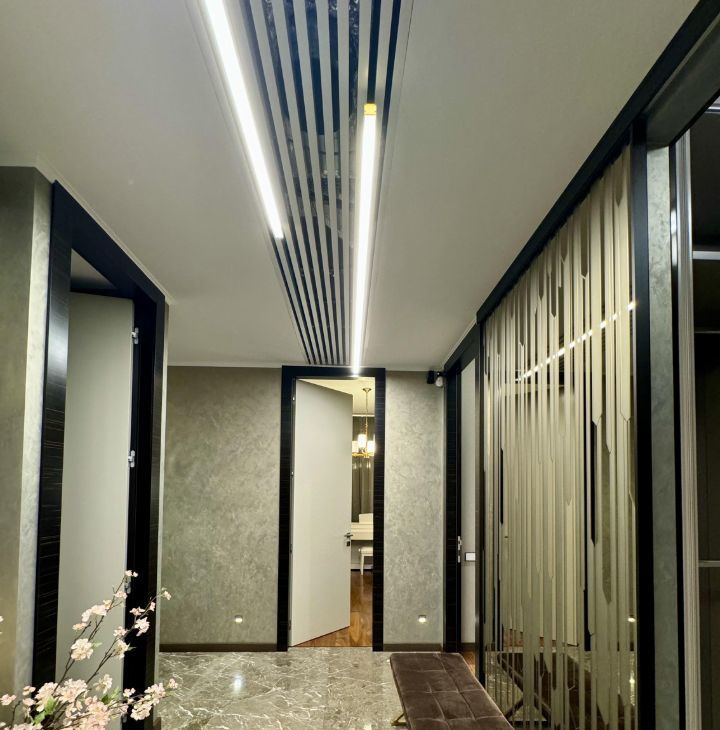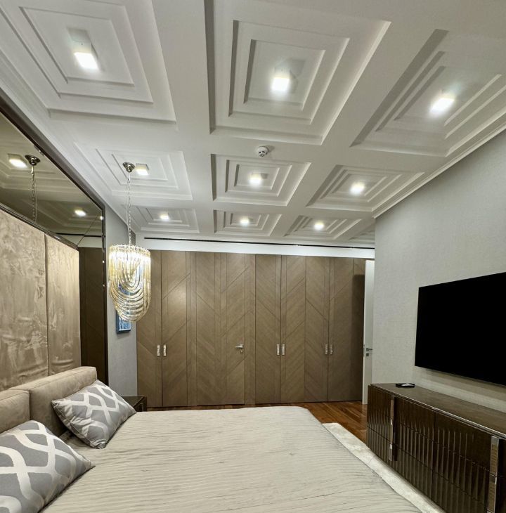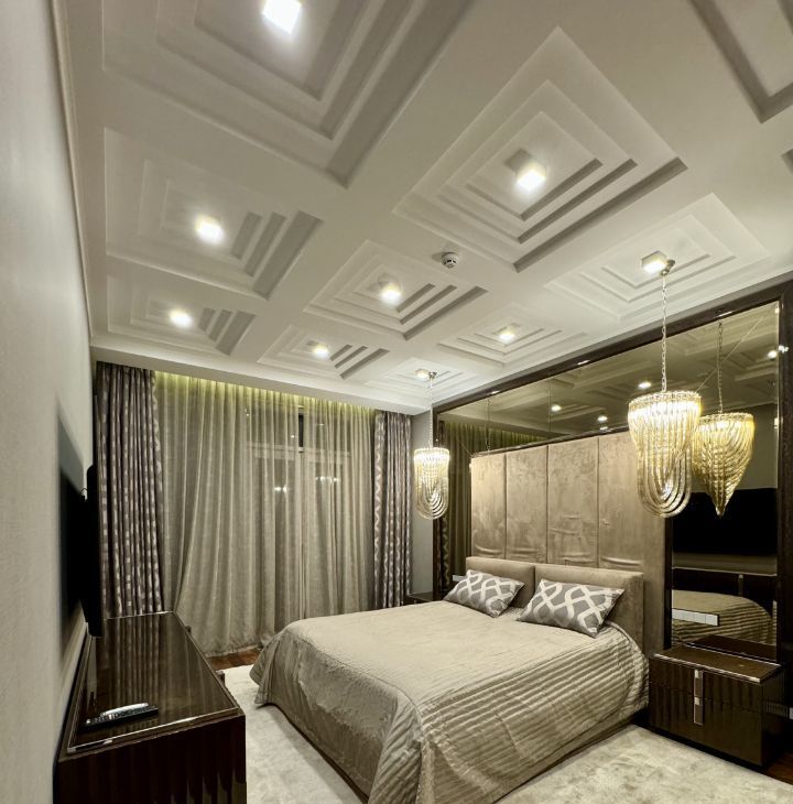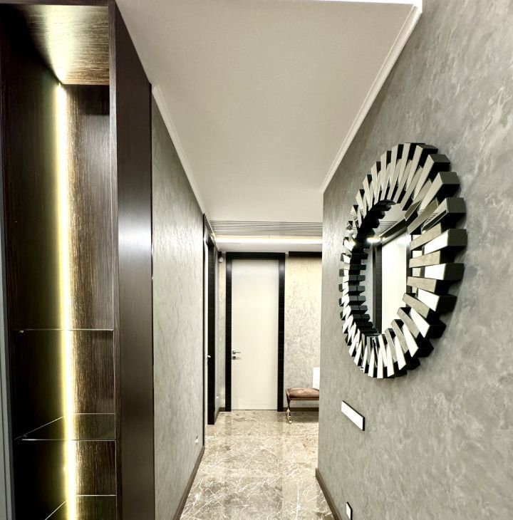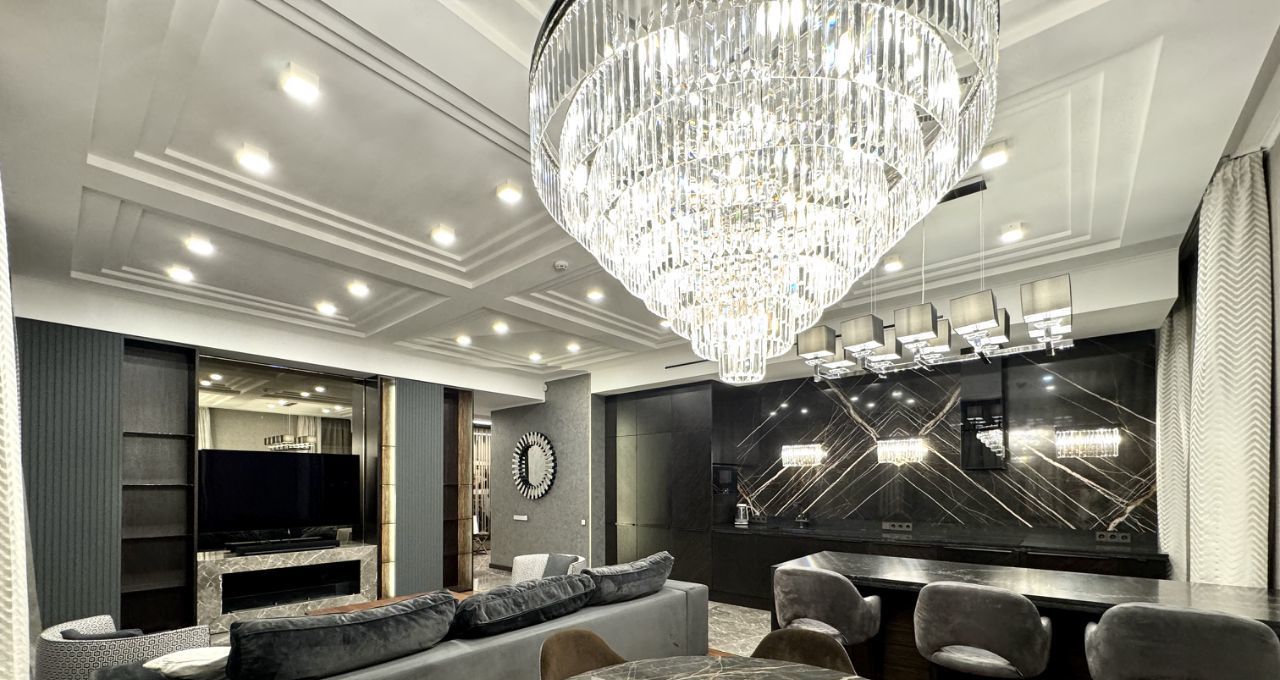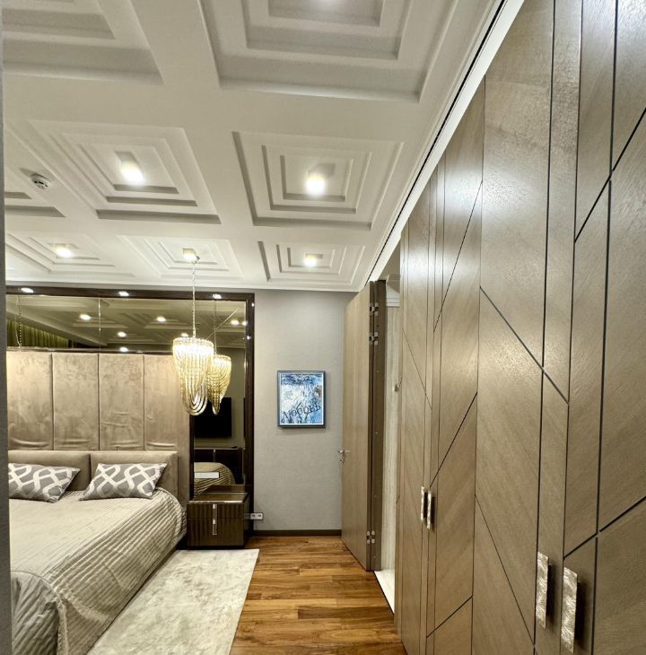 Интерьер выполнен в неоклассическом стиле с использование дорогих и натуральных материалов.