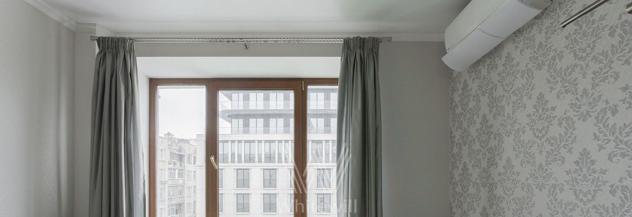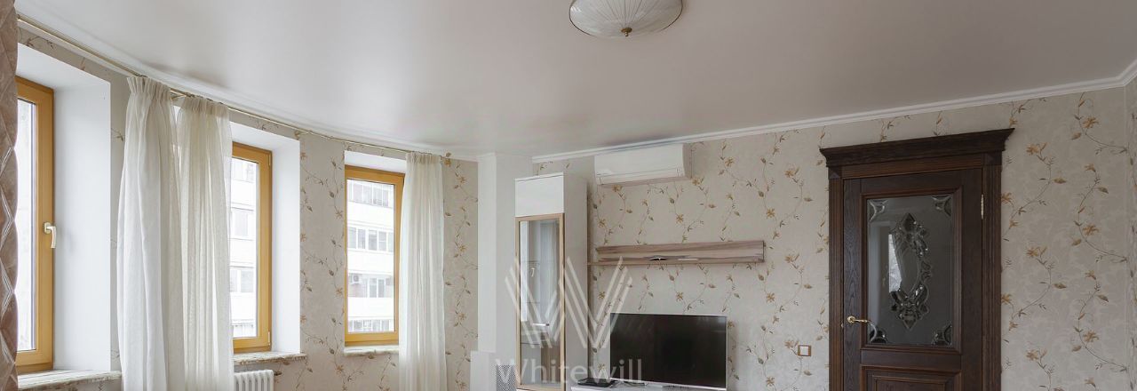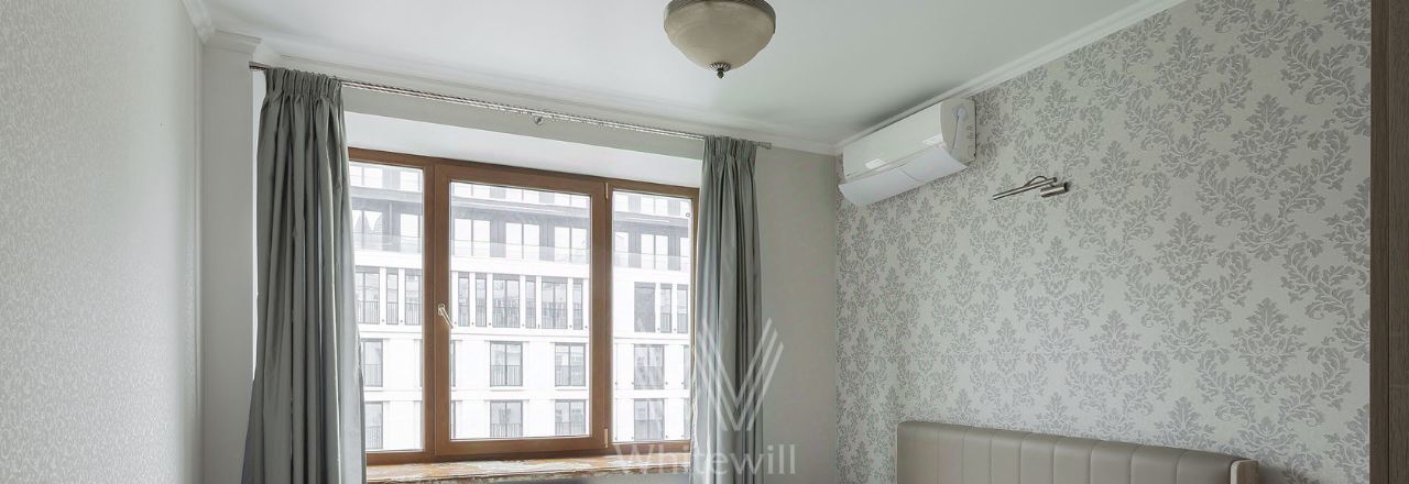 Планировка: гостиная, кухня-столовая, 2 спальни, ванная комната, гостевой санузел, холл. Квартира полностью меблирована и оснащена бытовой техникой включая сушильную машину. Установлена система кондиционирования. Из окон открывается вид в переулок и во двор.