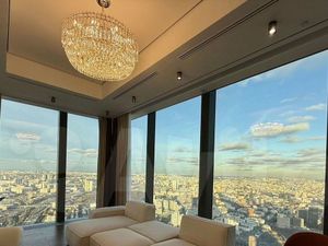 Квартира с 2-мя спальнями и террасой в комплексе Crystal House. Выполнен дизайнерский ремонт с использованием натурального дерева. Интерьер оформлен в светлых тонах, на полу выложена тёмная паркетная доска. Высокие потолки украшены авторскими люстрами от Fendi с декором из стекла. Квартира полностью меблирована, в гостиной зона отдыха с мягкими белыми диванами от Fendi. Оборудована кухня со встроенной бытовой техникой Miele и столовой зоной на 5 персон.