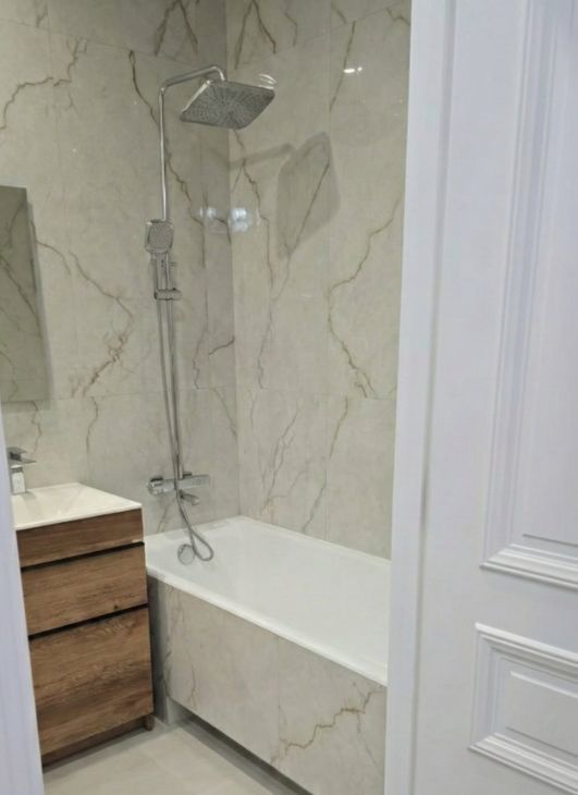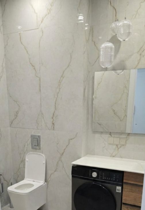 Санузел: Совмещенный, отделка крупноформатным керамогранитом "под мрамор", новая качественная сантехника, ванна.