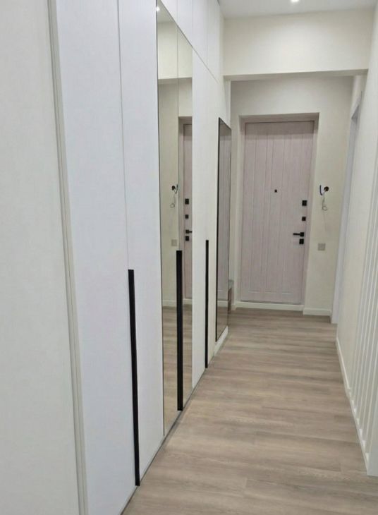 Прихожая: Установлен огромный встроенный зеркальный шкаф во всю стену - много места для хранения вещей, при этом сохраняется ощущение простора.