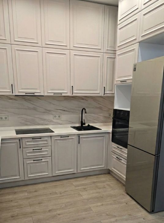 Встроенная кухонная техника: посудомоечная машина, холодильник, варочная панель, духовой шкаф.