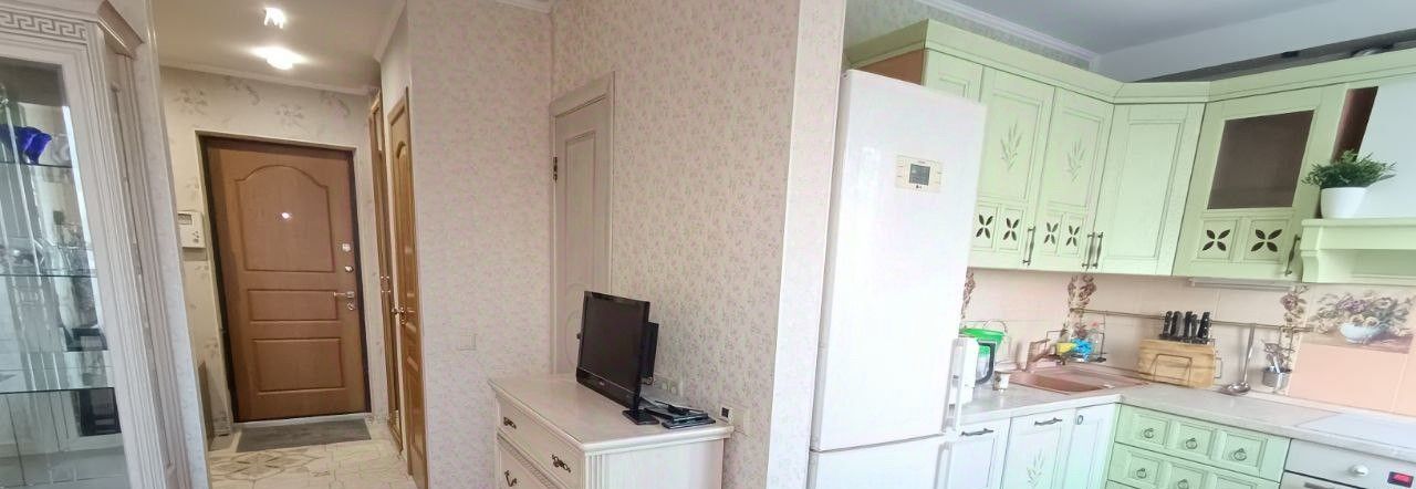 - современный гарнитур, холодильник, индукционная плита, микроволновая печь, ПММ, кондиционеры в 2-х комнатах (сплит-системы), обеденный стол, стулья, телевизор;
