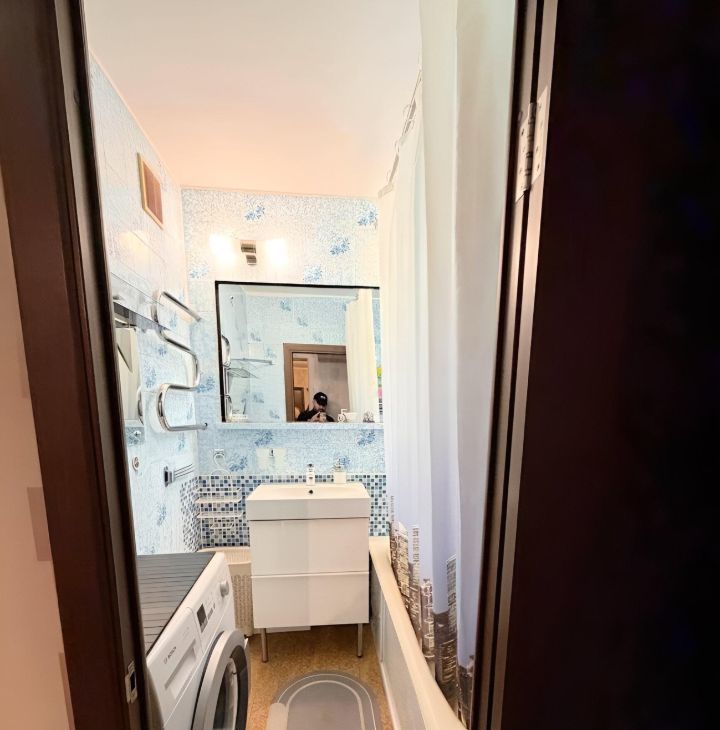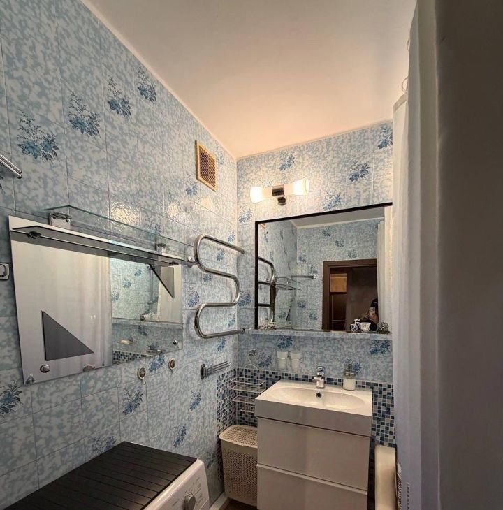 Ванная комната отделана плиткой, аккуратная и чистая. Установлена ванна с душевой шторой, современная раковина с тумбой для хранения, зеркало. Состояние — отличное, всё исправно.
