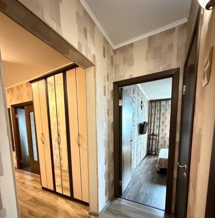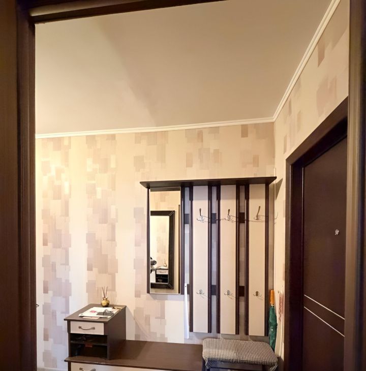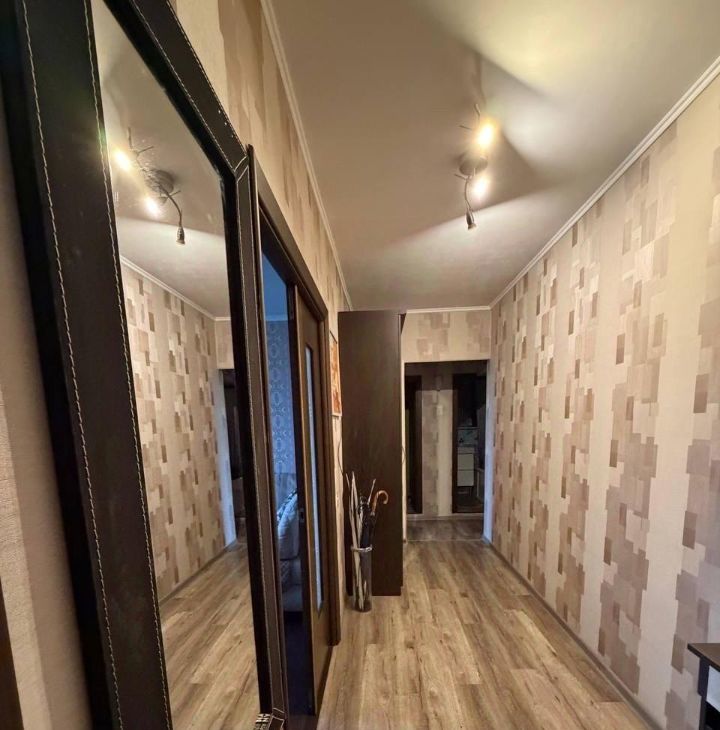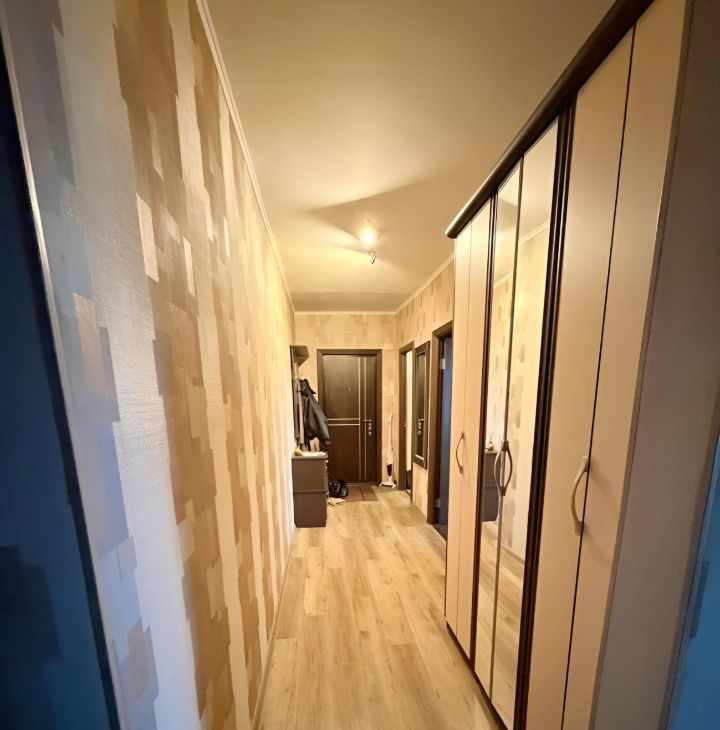 Просторный коридор и функциональная прихожая. На полу — ламинат, стены в нейтральных оттенках. Установлен вместительный шкаф-купе с зеркальными фасадами, что визуально расширяет пространство. Есть зона для хранения обуви и верхней одежды. Прихожая удобная и не загромождённая.