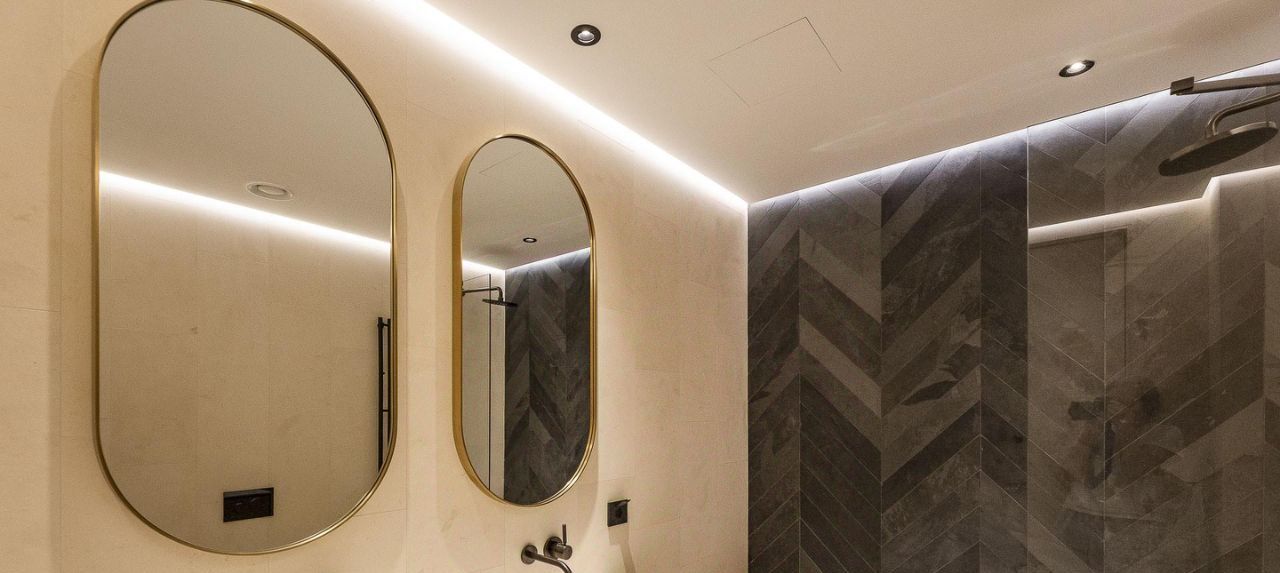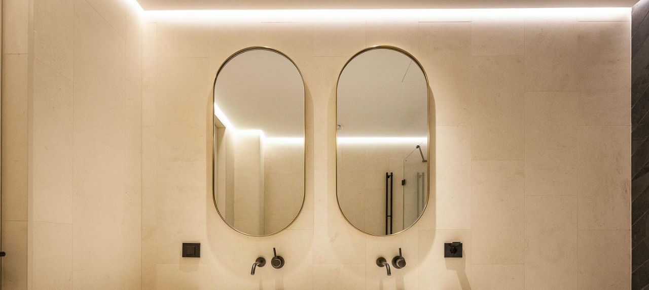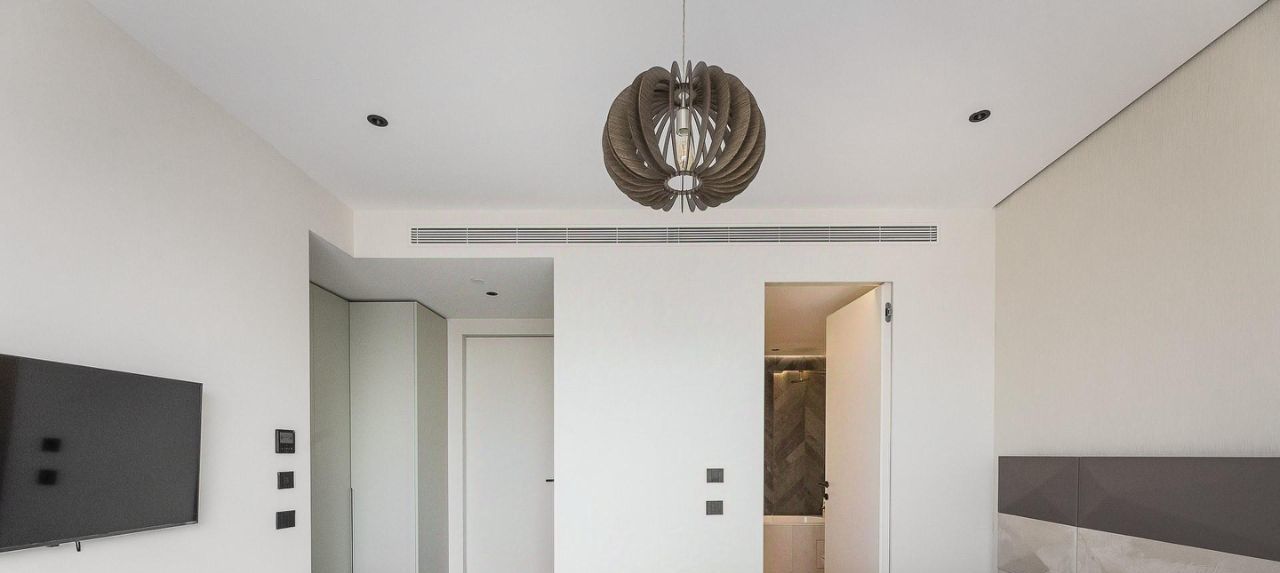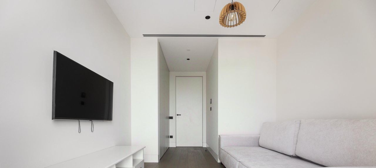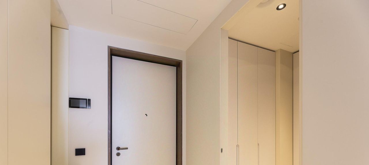 В отделке использованы премиальные материалы: инженерная доска из дуба, натуральный камень, сантехника Dornbracht, межкомнатные двери Barausse, выключатели Bticino, внутрипольные конвекторы Varmann.
