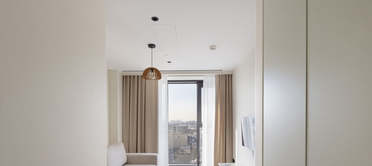 В апартаментах панорамное остекление с использованием стеклопакетов Schuco с прекрасной звукоизоляцией - ж/д с закрытыми окнами не слышно.