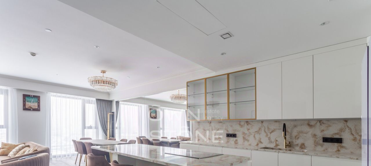 Великолепная 3-комнатная квартира. 21/34 этаж. Высота потоков - 3.2 м. Количество спален: 2. Количество санузлов: 1 раздельный, 1 совмещенный. Общая площадь: 128 кв. м. Площадь кухни: 15 кв. м. Площадь комнат: 40-27-20. Панорамный вид из окна