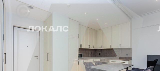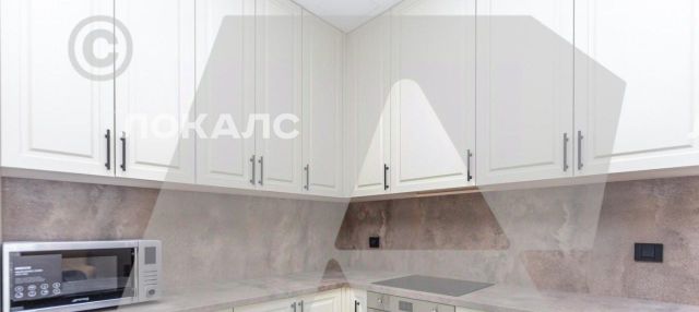 На кухне установлен встроенный холодильник, варочная панель, духовой шкаф, микроволновая печь, посудомоечная машина.