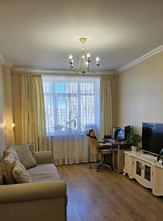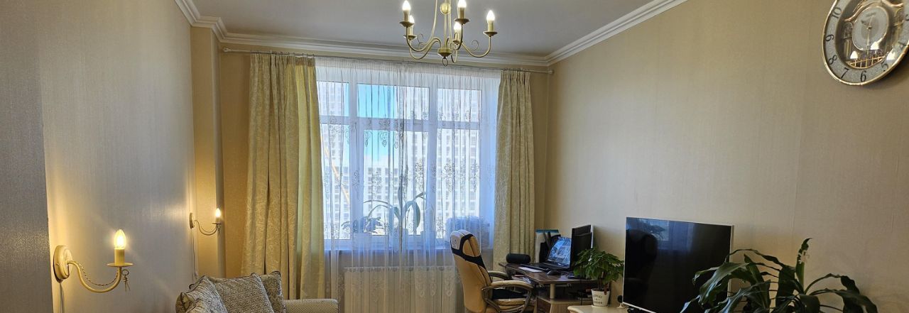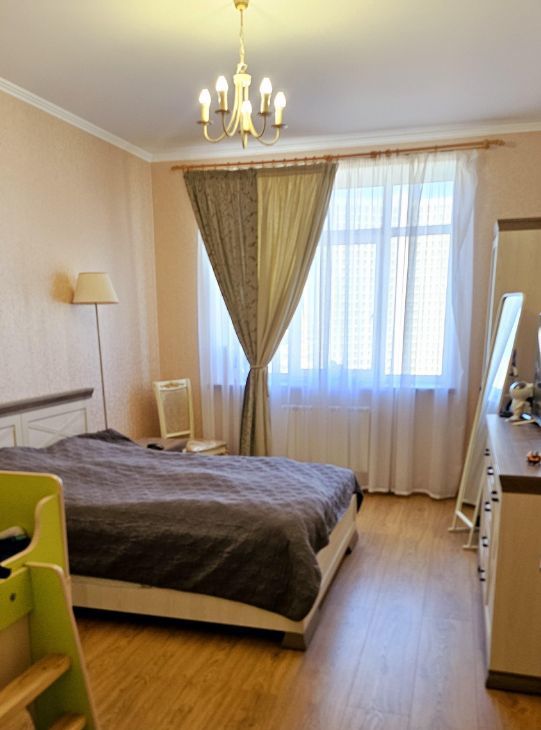 Сдаётся просторная трёхкомнатная квартира с евроремонтом в современном доме 2016 года постройки. Общая площадь составляет 100 кв. м, из которых 89 кв. м — жилая. Квартира расположена на 10-м этаже 12-этажного дома. Высокие потолки 3 метра добавляют ощущение простора. Из окон открывается вид во двор, что обеспечивает тишину и спокойствие.