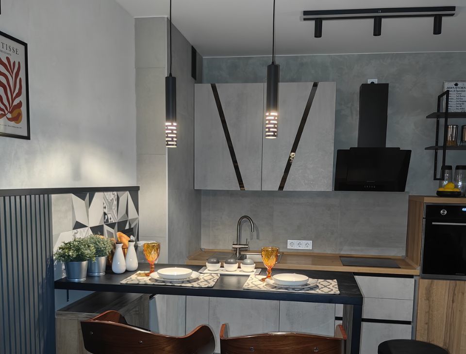 - Кухонный гарнитур фабричного изготовления, выполнен из экоплиты Эггер, по индивидуальному проекту, фурнитура BLUM (Германия), сантехника и фильтр для воды на кухне OMOIKIRI (Япония). Бытовая техника Maunfeld (Польша, Китай).