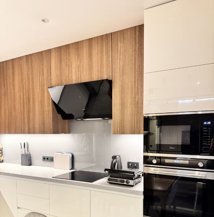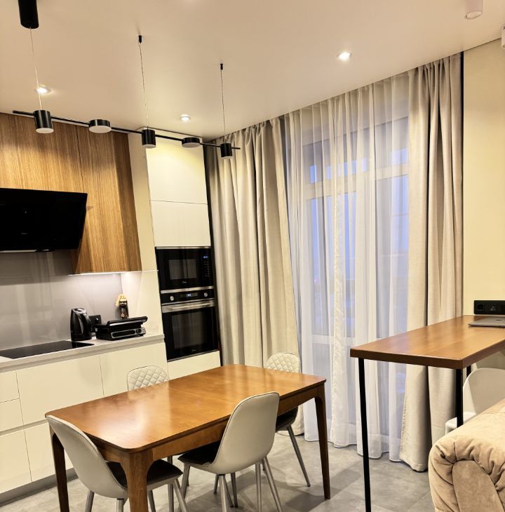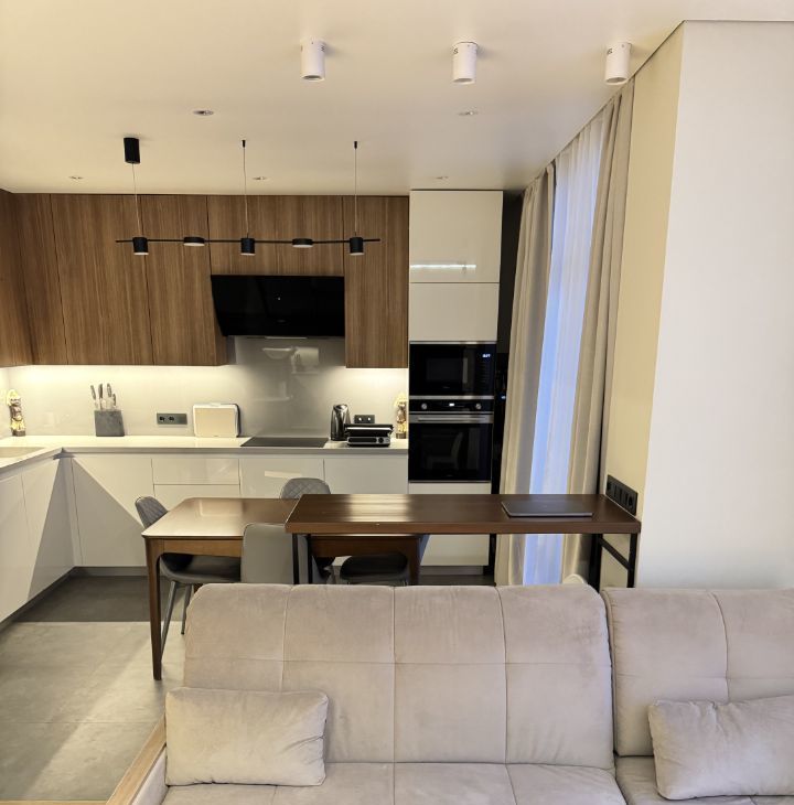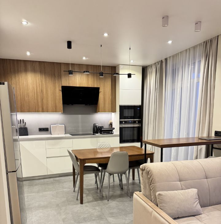 Кухня полностью укомплектована, (духовой шкаф, микроволновая печь, индукционная плита, холодильник на 550 л ), высота рабочей поверхности столешницы 97 см