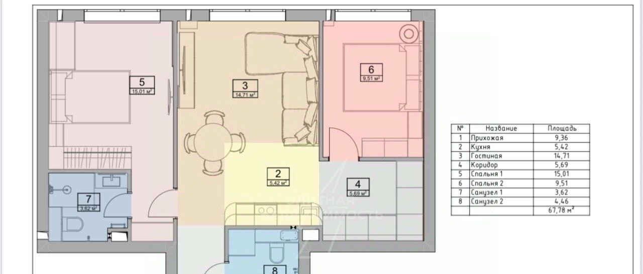Планировка : просторная кухня-гостиная, 2 спальни, 2 санузла.