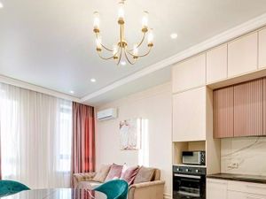 Квартира оформлена в дизайнерском стиле: современный ремонт, качественная мебель в комнатах и всё необходимое оборудование. В распоряжении арендаторов — кондиционер, холодильник, посудомоечная и стиральная машины, телевизор. Планировка включает один совмещенный и один отдельный санузел, ванна имеется. В квартире есть интернет, поэтому можно сразу приступать к работе или учебе.