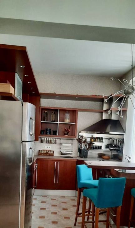 Кухня площадью 9 м² оборудована необходимой техникой, включая холодильник, электрическую варочную поверхность и духовой шкаф, посудомоечную машину, микроволновую печь. В гостиной установлен диван и телевизор. В спальне большая кровать и вместительные шкафы.