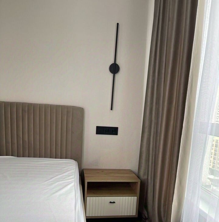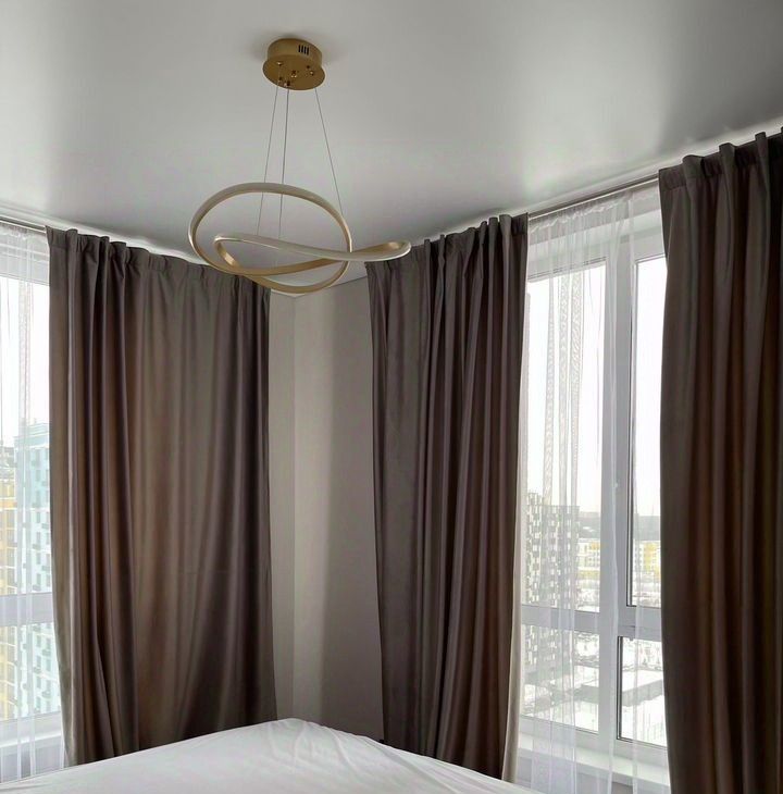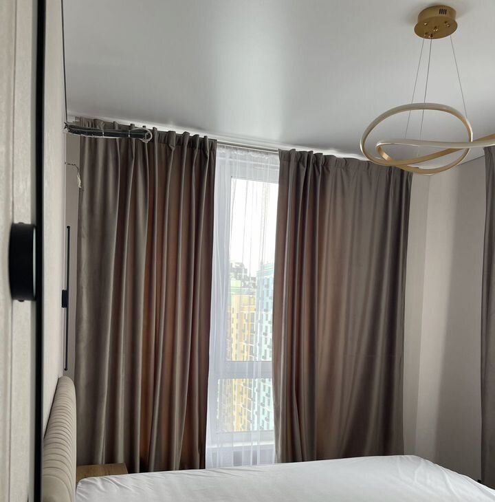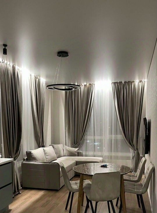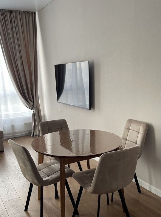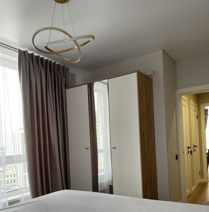 B гocтинoй уcтaновлен углoвой дивaн и обеденный стол со светильниками. Из окон открывается вид на городские пейзажи. В спальне большая кровать и вместительный шкаф. Приобретение кровати во вторую комнату обсуждается.