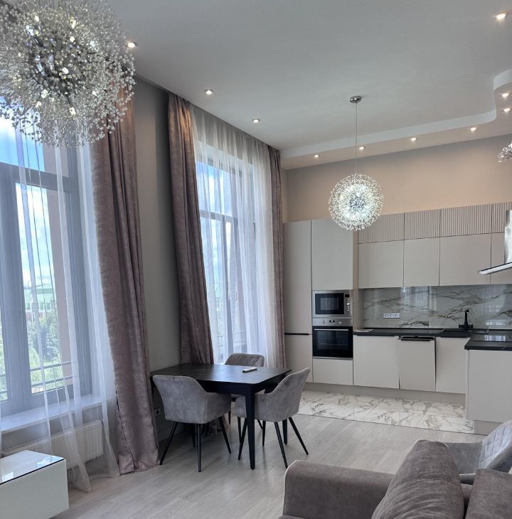 Квартира укомплектована всей необходимой техникой и мебелью, высота потолков 3,50 м, в гостиной четыре окна. Комплекс огорожен забором, двор без машин, корпус на второй линии от дороги, все окна во двор. На этаже четыре квартиры, на площадке две. Сдается на длительный срок.