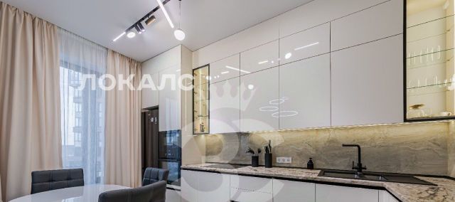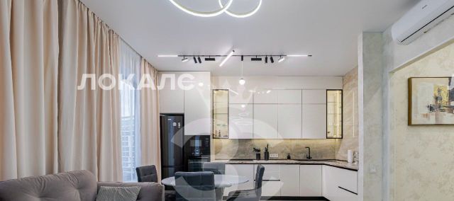 Зона кухни, плавно перетекающая в обеденную, выполнена в лаконичных светлых тонах и оснащена современной бытовой техникой премиального уровня.