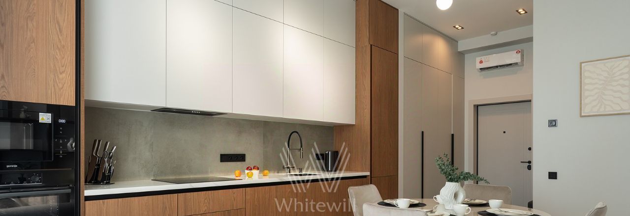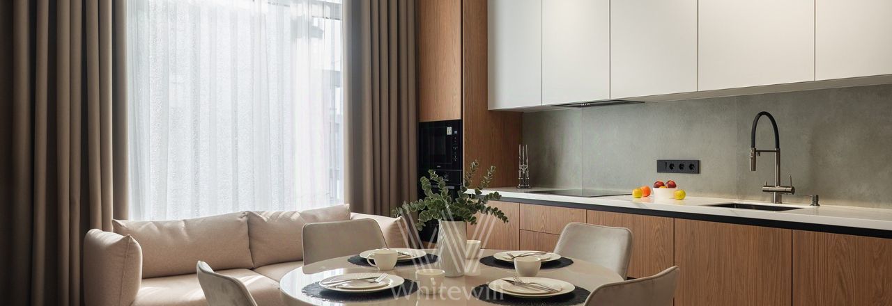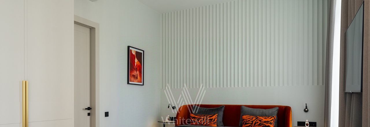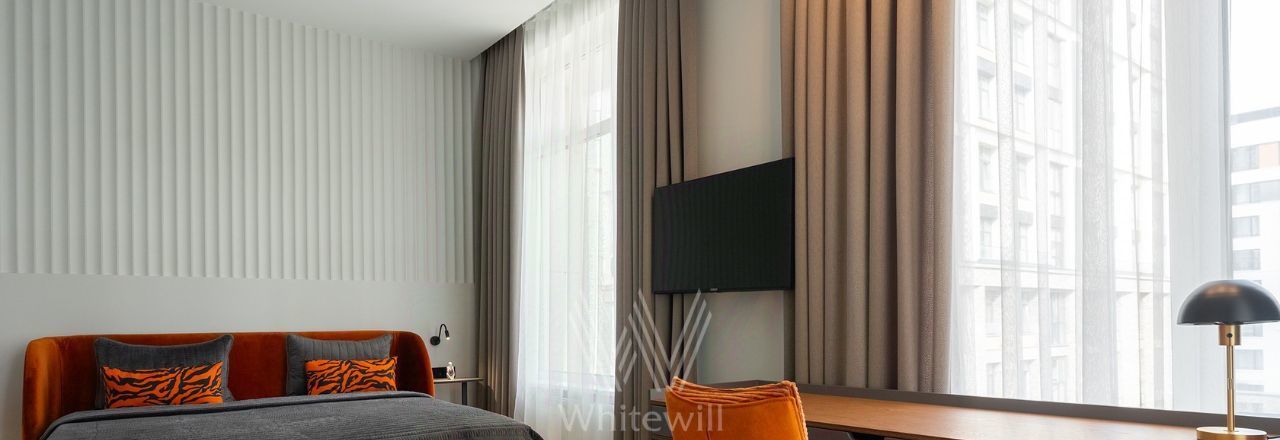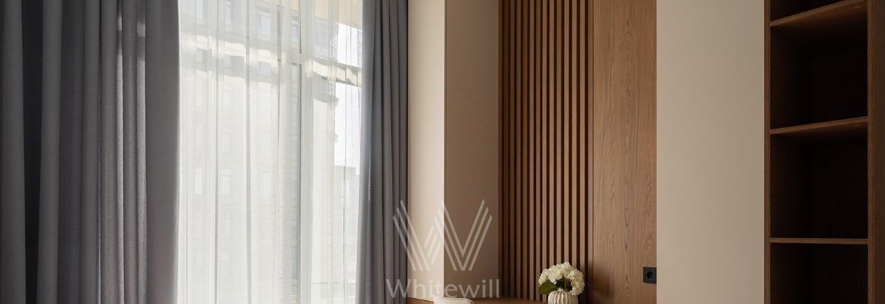 Видовая квартира с двумя спальнями общей площадью 69 м² в комплексе бизнес-класса Now на берегу Москвы-реки. Светлый интерьер оформлен в современном стиле. Планировка: кухня-гостиная с обеденной зоной, основная спальня с тремя окнами, вторая спальня, ванная комната, второй санузел с душевой, прихожая. Из спальни спланирован выход на лоджию с панорамным остеклением. Квартира полностью меблирована и укомплектована бытовой техникой. Установлена система кондиционирования, стиральная и посудомоечная машина. Из окон открывается вид на реку и территорию комплекса. Предусмотрено одно машино-место за дополнительную плату.
