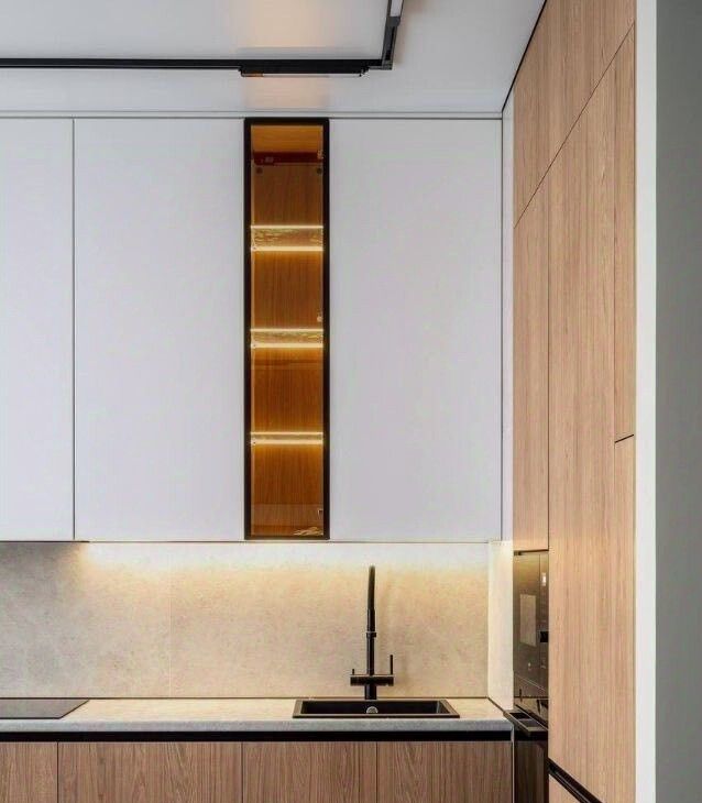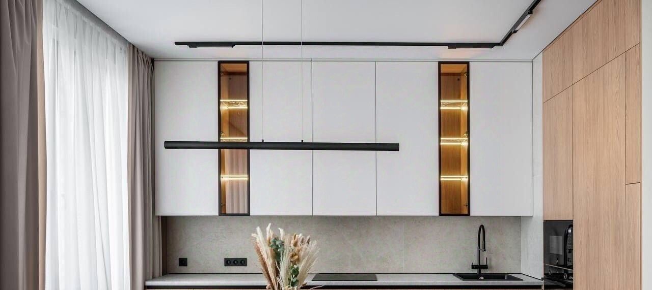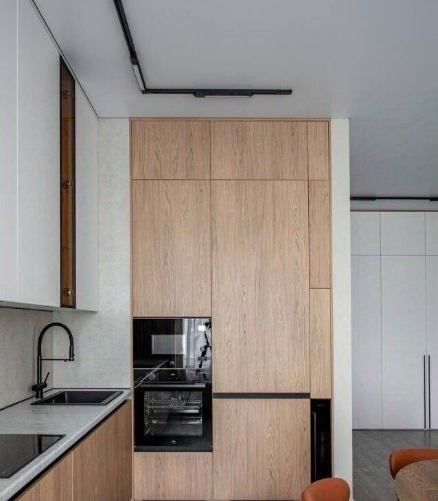 — Встроенная техника: холодильник увеличенного объёма, винный шкаф, духовой шкаф и СВЧ, варочная поверхность, вытяжка, стиральная и сушильная машины