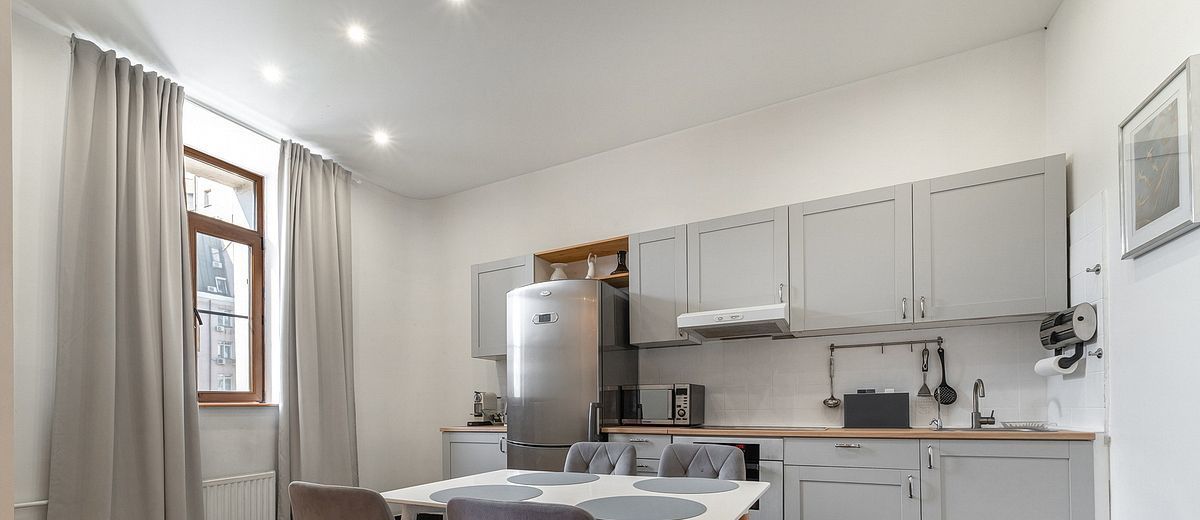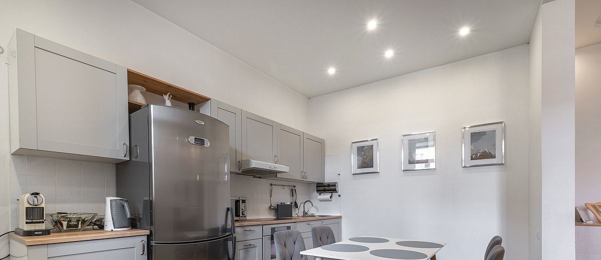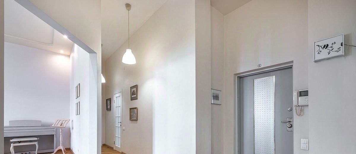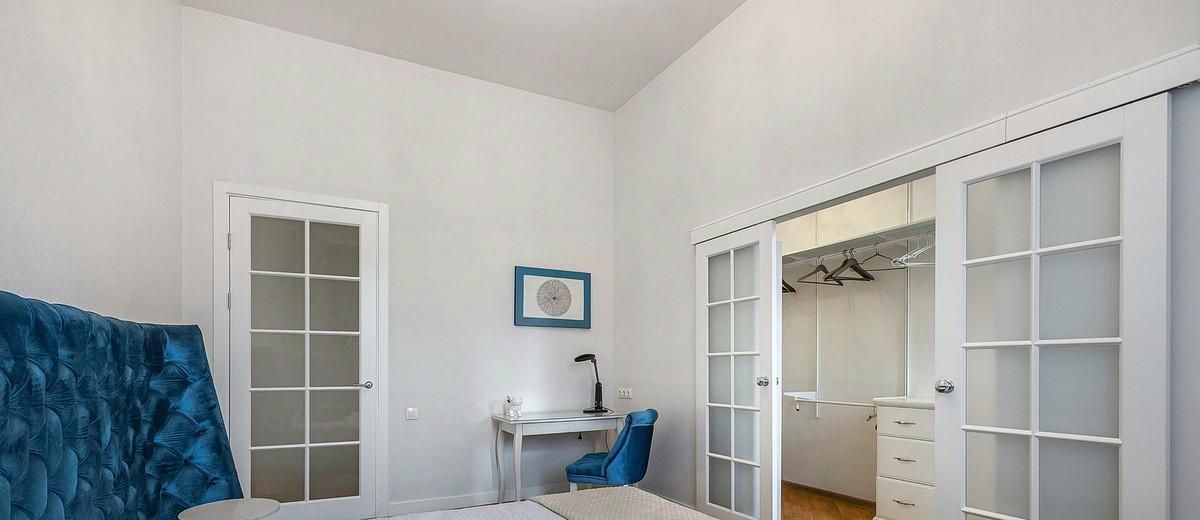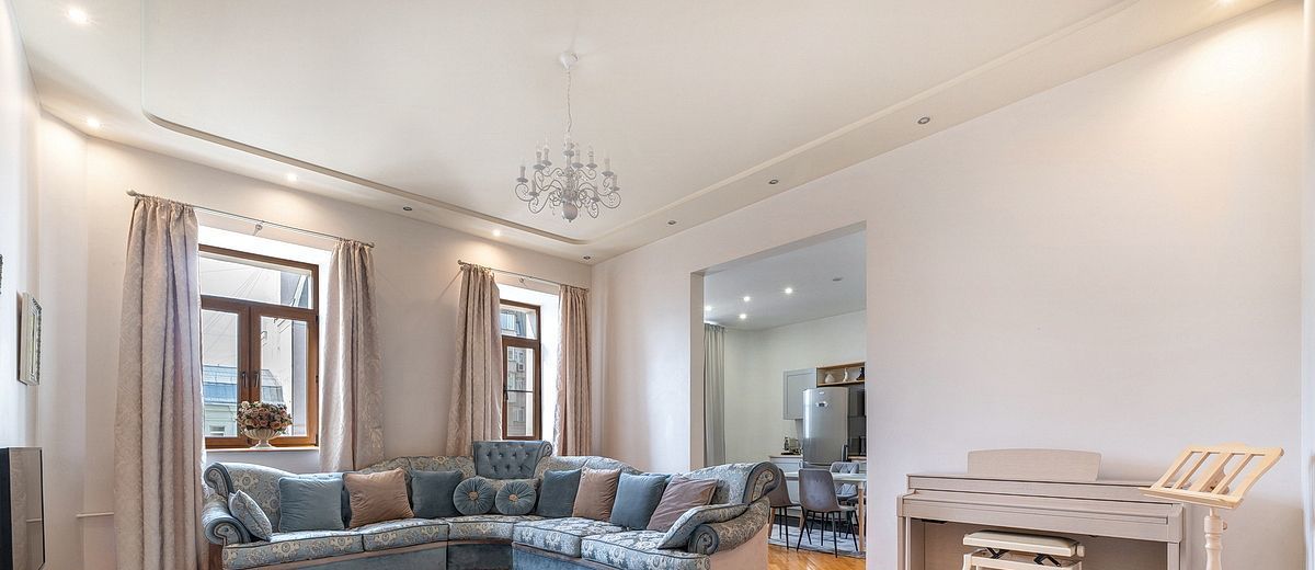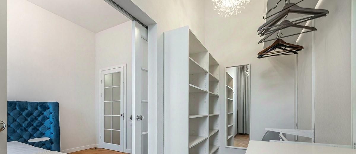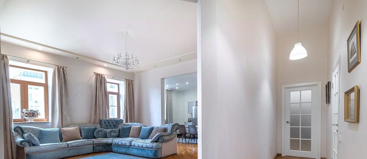 Площадь квартиры 125м, потолки 3.6м. Гостиная 29м, кухня 15м, 2 спальни 25м и 22м, гардеробная с раздвижными дверьми и окном, прачечная, 2 совмещенных с/узла (с душем и с ванной), просторный холл