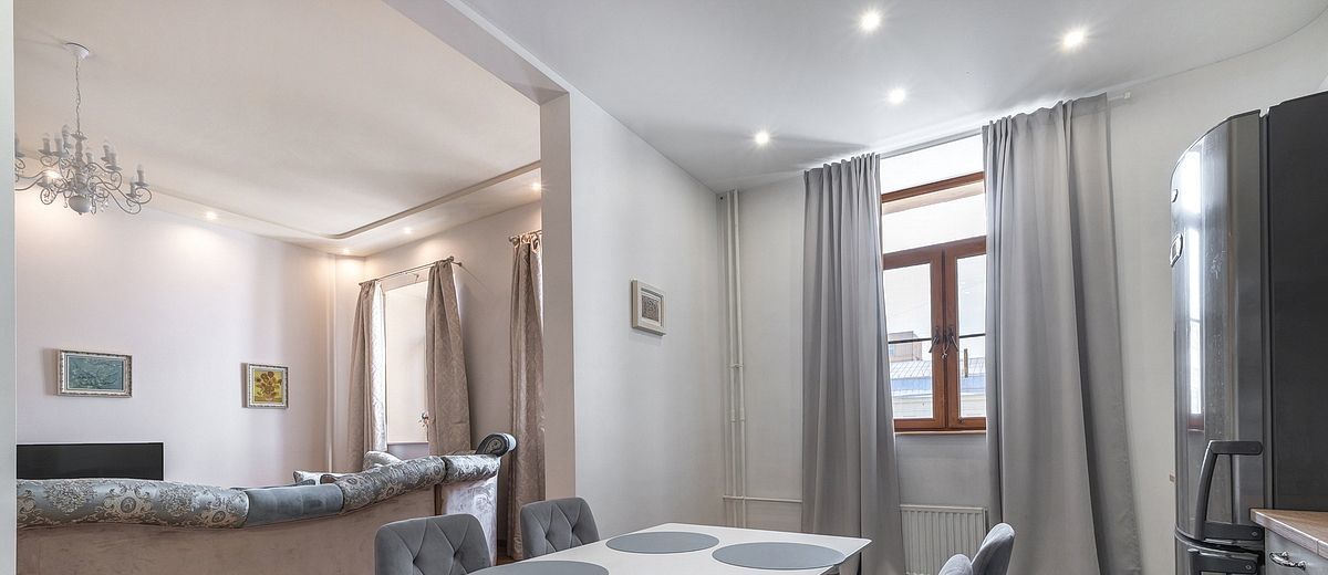 Свежий ремонт, качественный дубовый паркет во всех комнатах, натяжные потолки, деревянные стеклопакеты, новые двери, много мест для хранения, до 7 спальных мест.