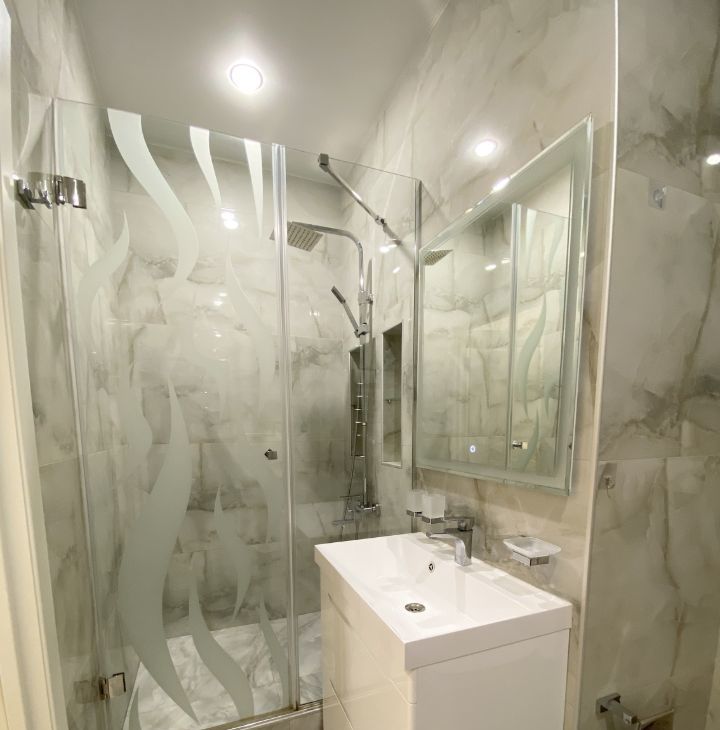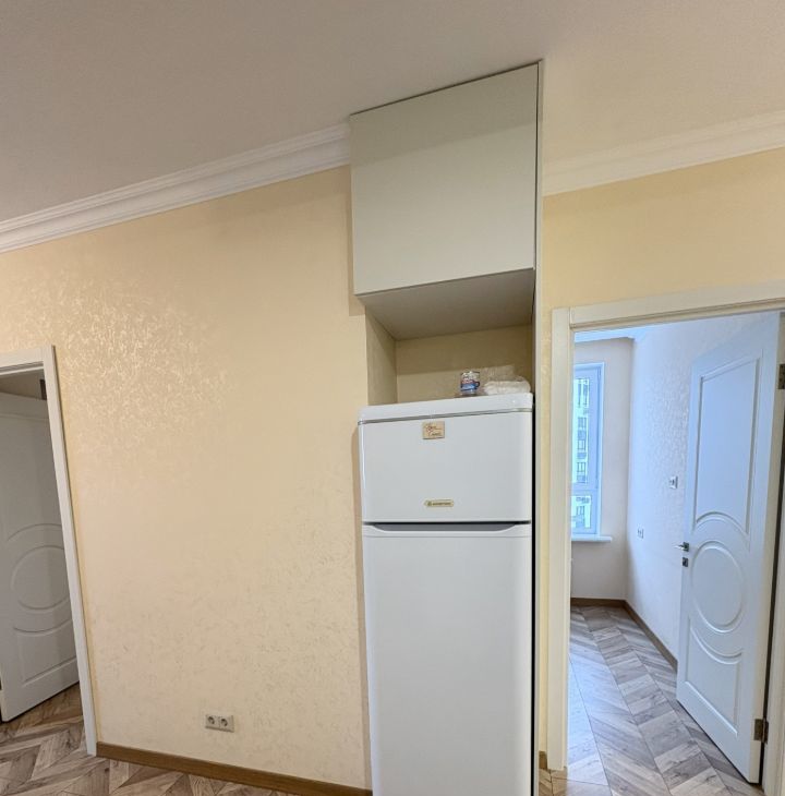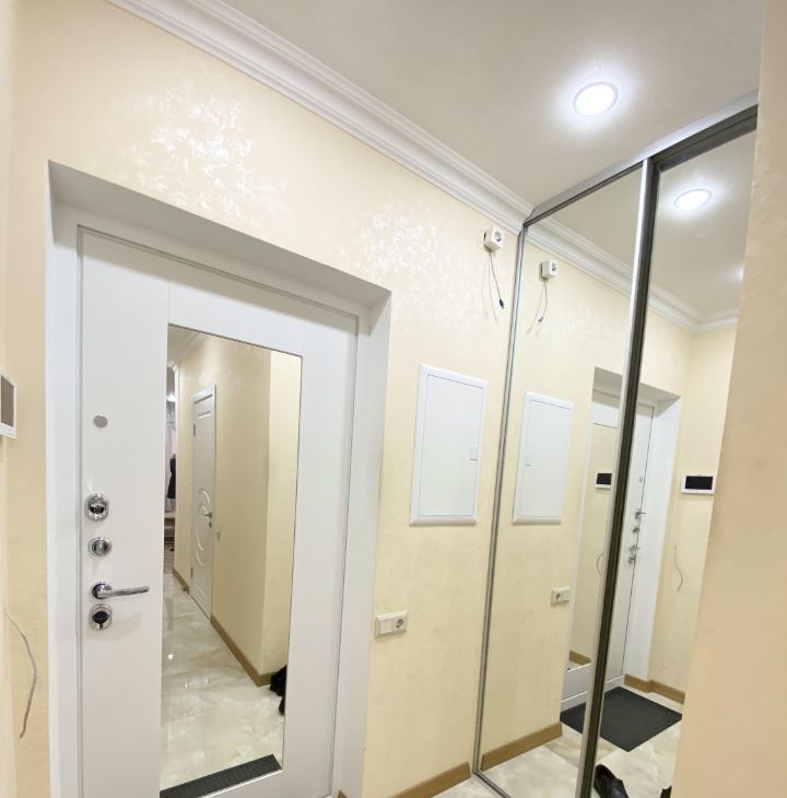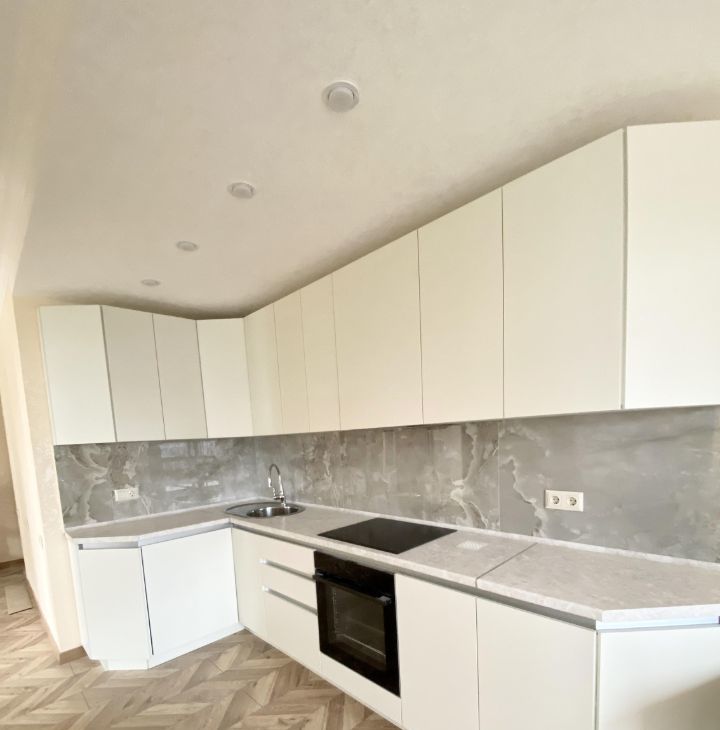 Кухня со встроенной техникой, есть микроволновая печь. Кондиционер. Всё, как на фото. Возможна покупка посудомоечной машины. Санузел в плитке. Полы с подогревом.