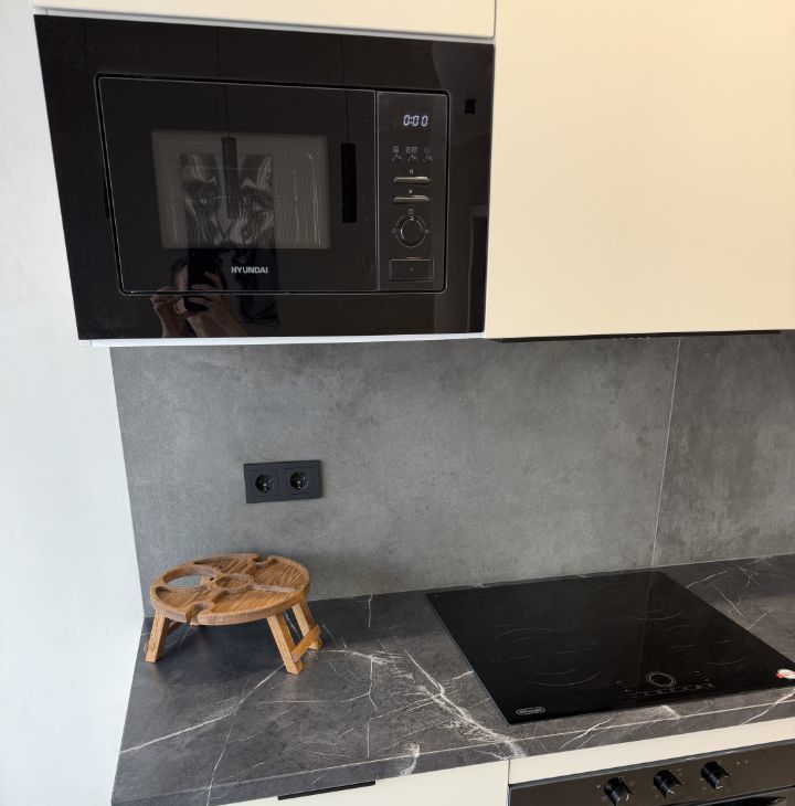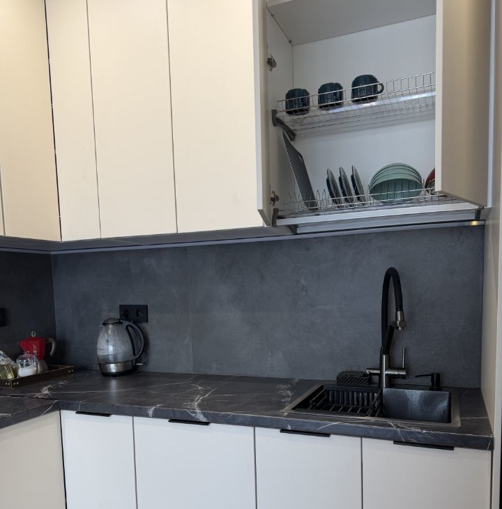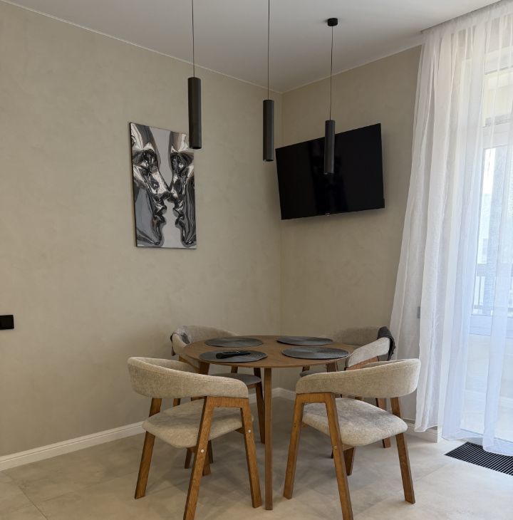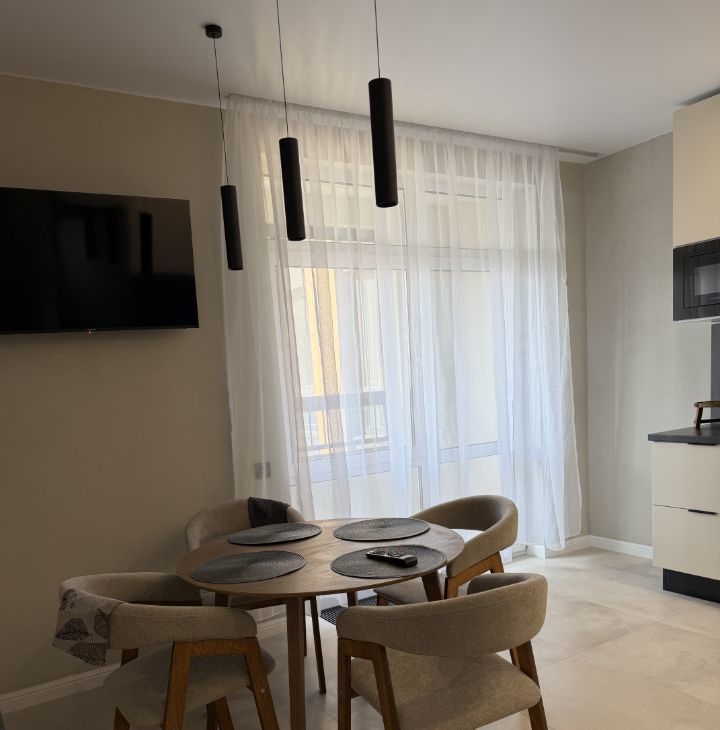 На кухне расположен большой поворотный телевизор со всеми каналами и приложениями.