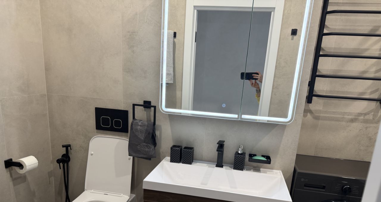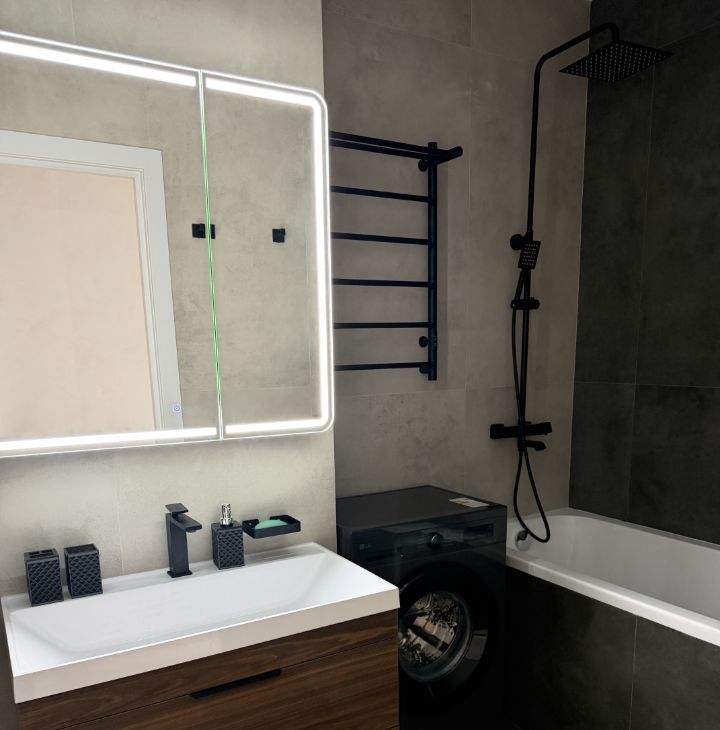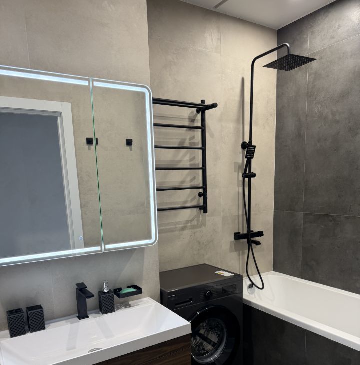 В квартире просторный совмещённый санузел со стиральной машиной.