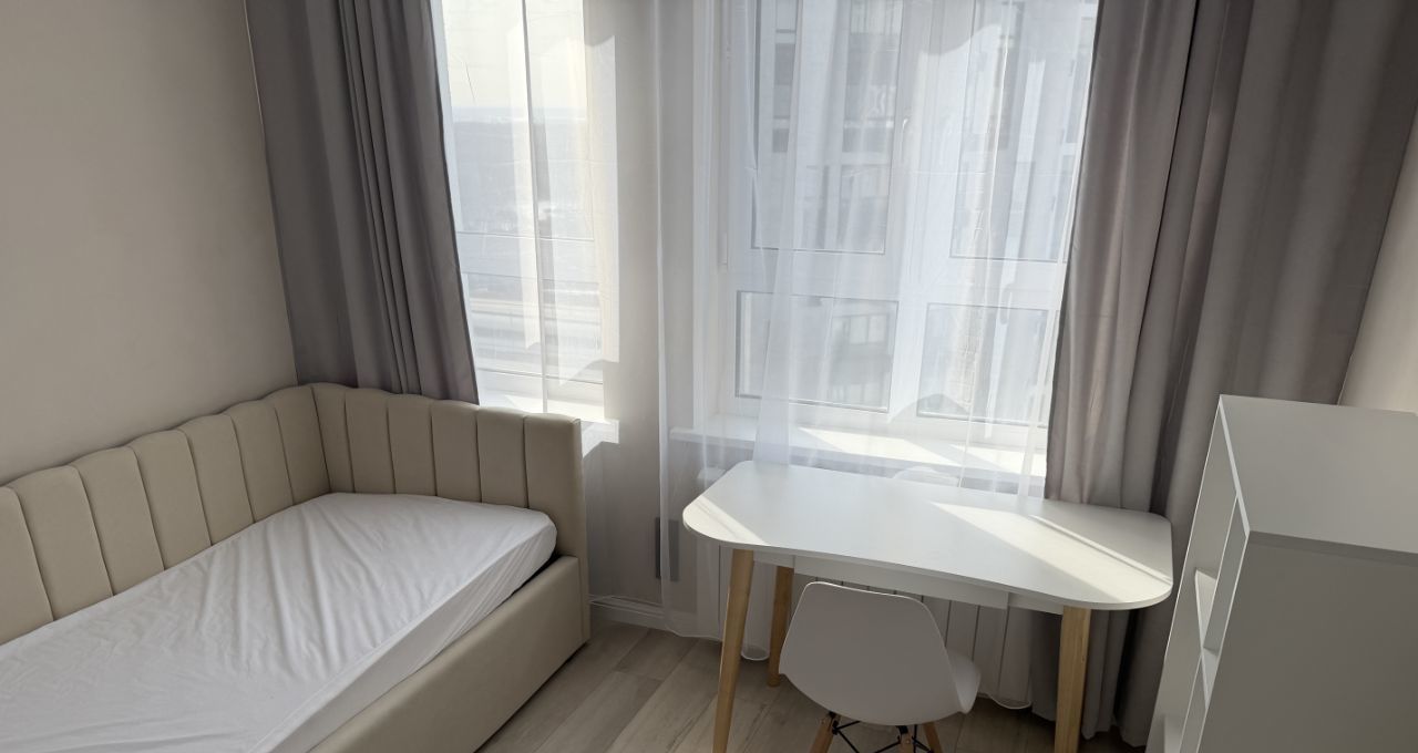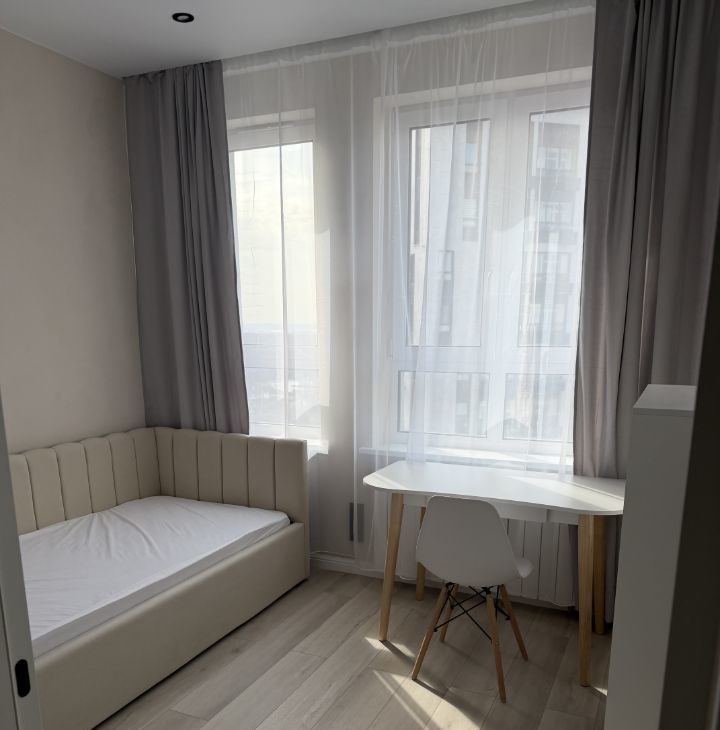 В детской комнате двухметровая кровать с ортопедическим матрасом и подъемным механизмом (доп место для хранения), шкаф, рабочий стол и стеллаж.