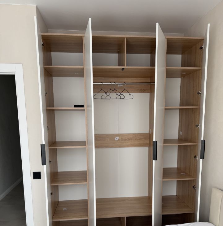 В спальне кровать с подъёмным механизмом (дополнительное место хранения) и мягким изголовьем. Ортопедический матрас с нуматрасником. Вместительный встроенный шкаф, большой телевизор.