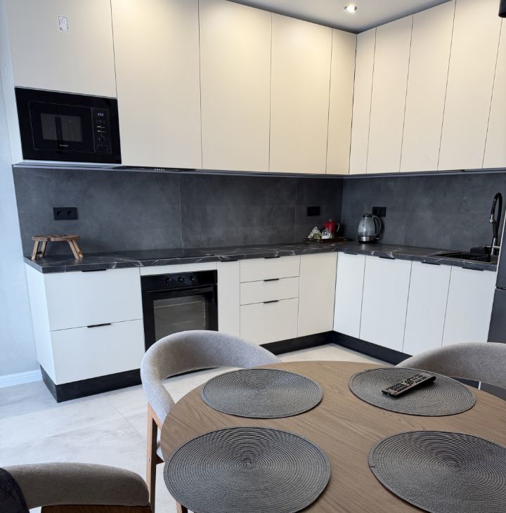 Справа от прихожей просторная кухня-гостиная с зоной отдыха и столовой зоной на 4-6 персон( стол раскладывается, на фото вариант для 4-х персон) . Функциональный кухонный гарнитур, который является отличной рабочей зоной.