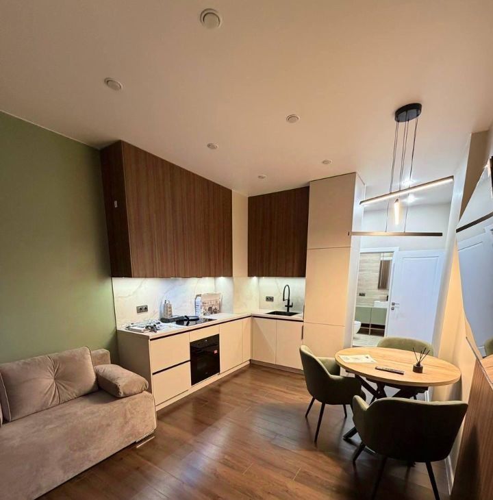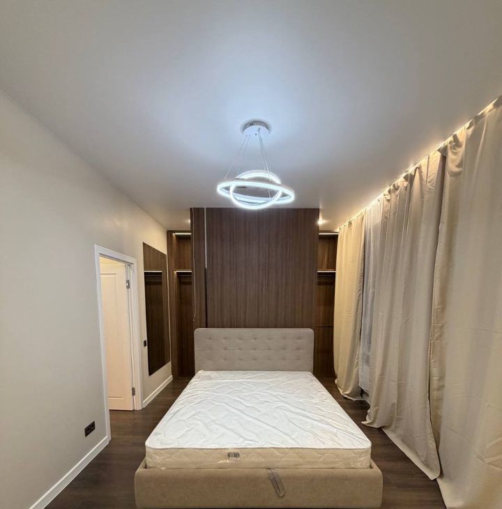 В квартире сделан современный дизайнерский ремонт, который создаёт уют и стиль. Просторная кухня оснащена всей необходимой мебелью и техникой: холодильником, посудомоечной машиной и телевизором. В комнате также есть мебель, а для вашего комфорта установлены кондиционер и стиральная машина. Совмещённый санузел оборудован ванной, что позволит вам расслабиться после долгого дня.