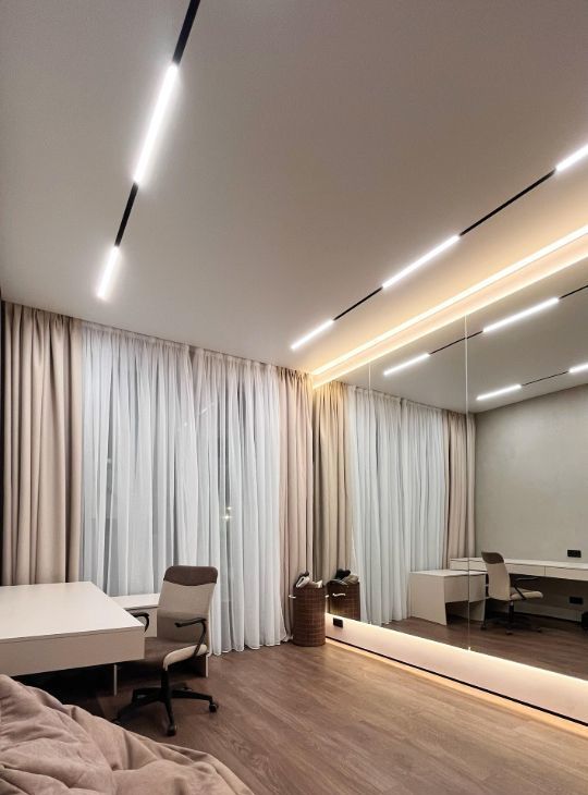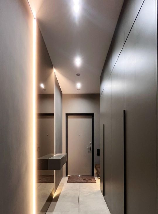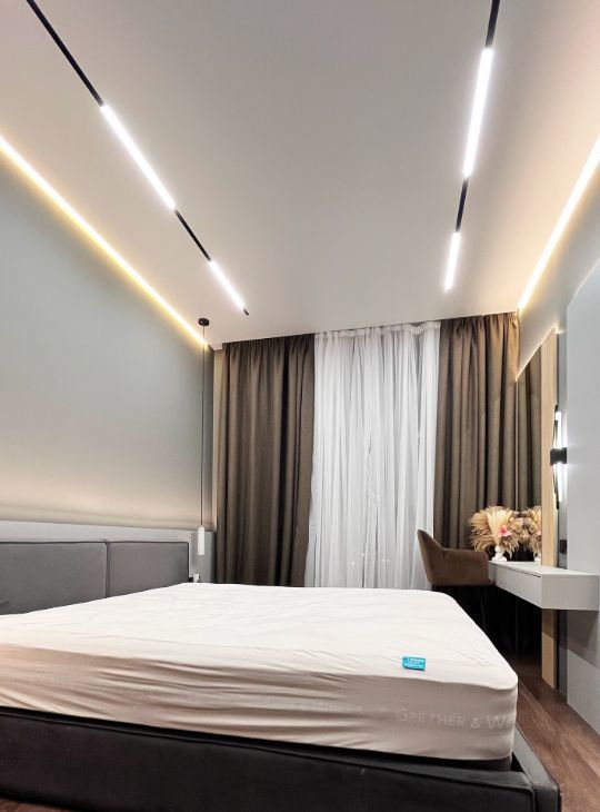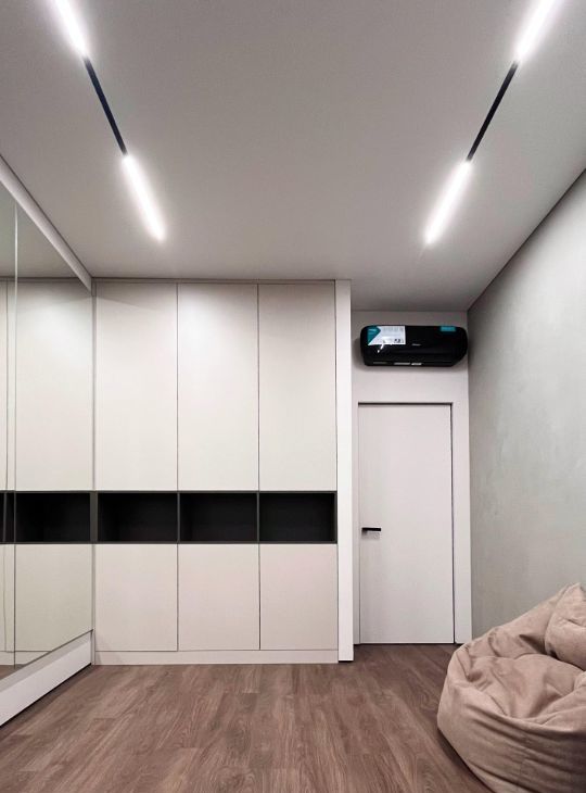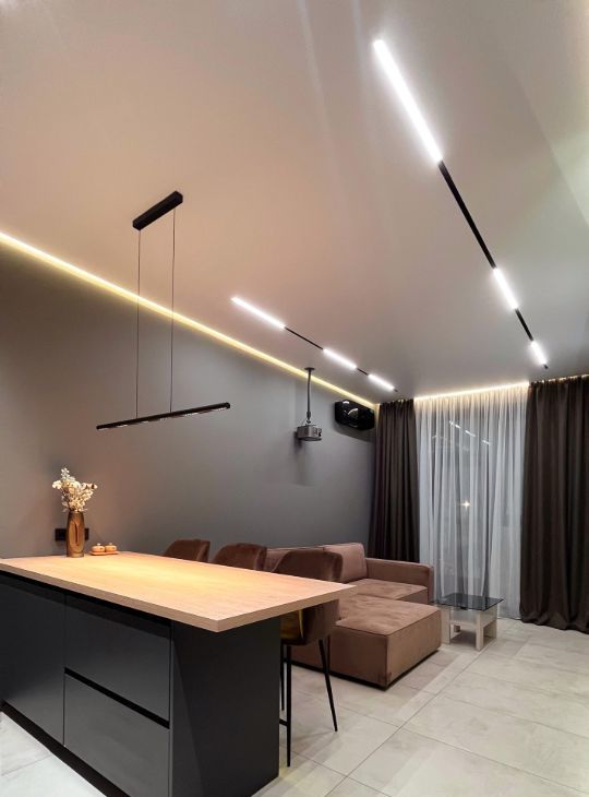 Квартира оборудована современным освещением, которое позволяет создавать разные сценарии от яркого к приглушенному и контурной подсветке.