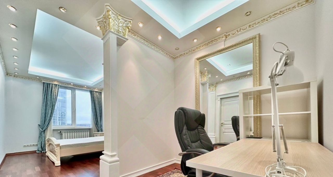 Планировка: гостиная, отдельная кухня, спальня с панорамным эркером, спальня с зоной кабинета, с/у с джакузи.