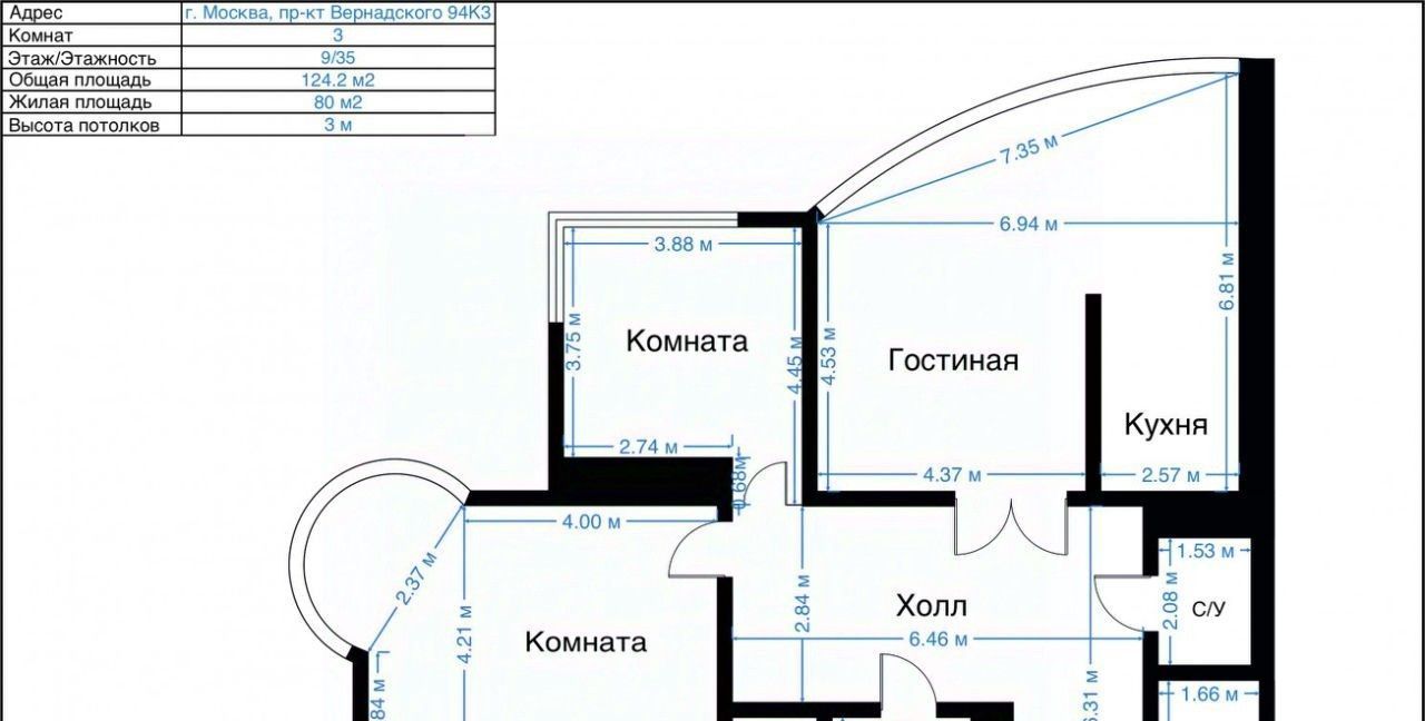 3-к кв. Москва просп. Вернадского, 94к3 (124.2 м²)