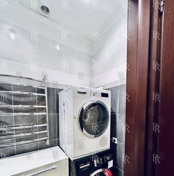 Квартира полностью меблирована, кухонный гарнитур укомплектован всей необходимой бытовой техникой, в постирочной комнате установлены стиральная и сушильная машины.