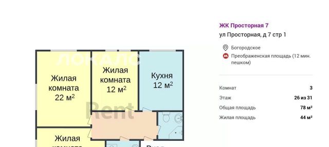 Предлагается 3-комнатная квартира общей площадью 78 м² в ЖК "Просторная 7" недалеко от станции метро "Преображенская площадь". Для комфортного проживания в наличии имеется вся необходимая мебель. Кухонный гарнитур оснащен посудомоечной машиной. Окна обращены во двор и на улицу.