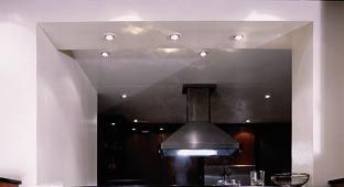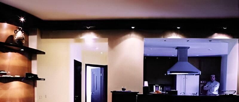 Кухонная зона 15м2 открывается баром в просторную гостиную 43,9м2, обрамленную симметричными полукруглыми стенами, оформленными строгими минималистичными полками с необычной, очень эффектной галогенной подсветкой.