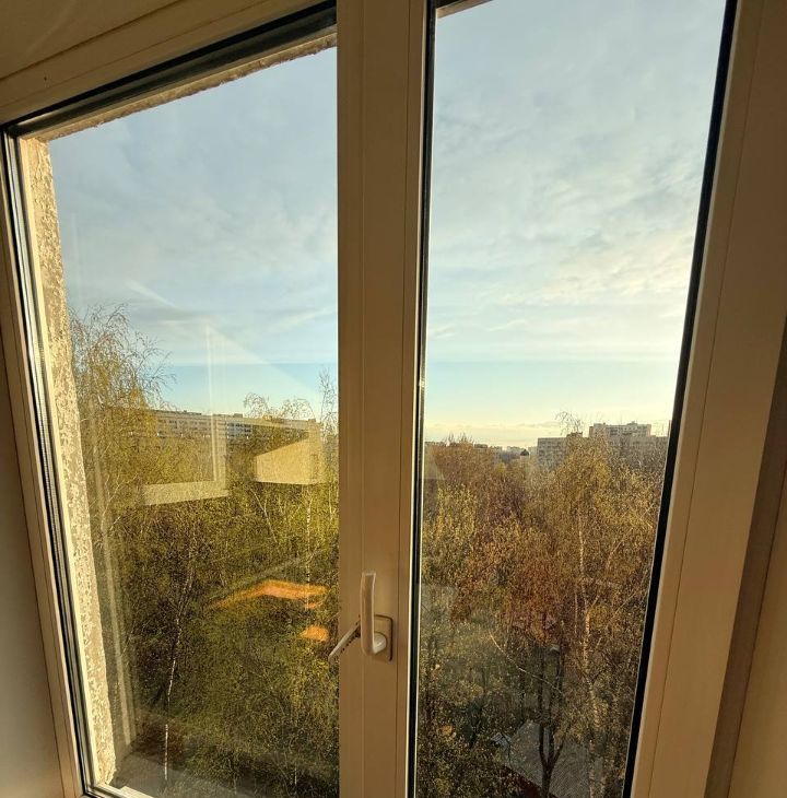 Квартира очень светлая — большие окна, много естественного света и отсутствие эффекта окна в окна. Из окон открывается приятный вид на зеленый двор.